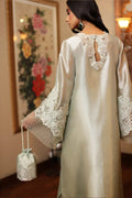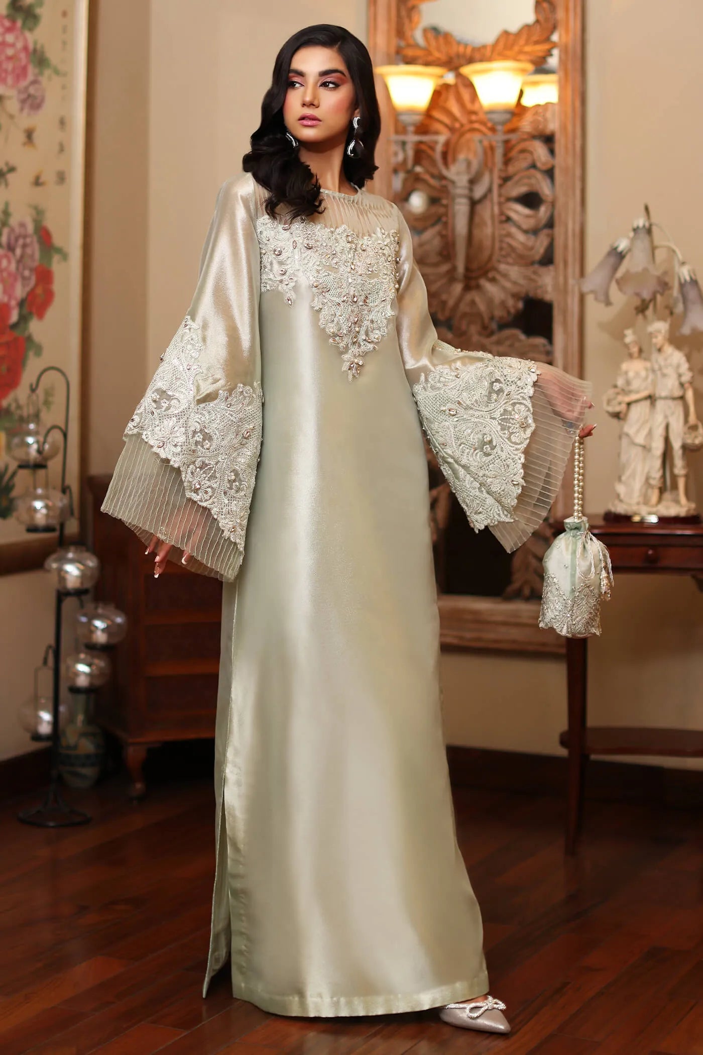 Dive into the ethereal elegance of ‘Aqua Serenity’. This exceptional creation showcases a flawless aqua kaftan, adorned with delicate embroidery of reshams and tilla. Further the distinctively pleated organza sleeves and neckline Meticulously hand embellished with sparkling crystals, sequins, stones, pipes, Swarovskies, and pearls, Each bead hand-placed, becomes a shimmering star on this aqua canvas.
