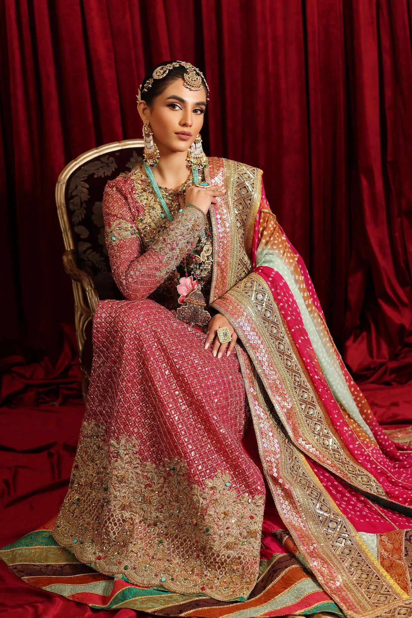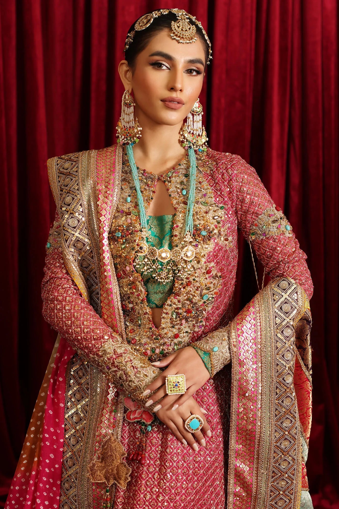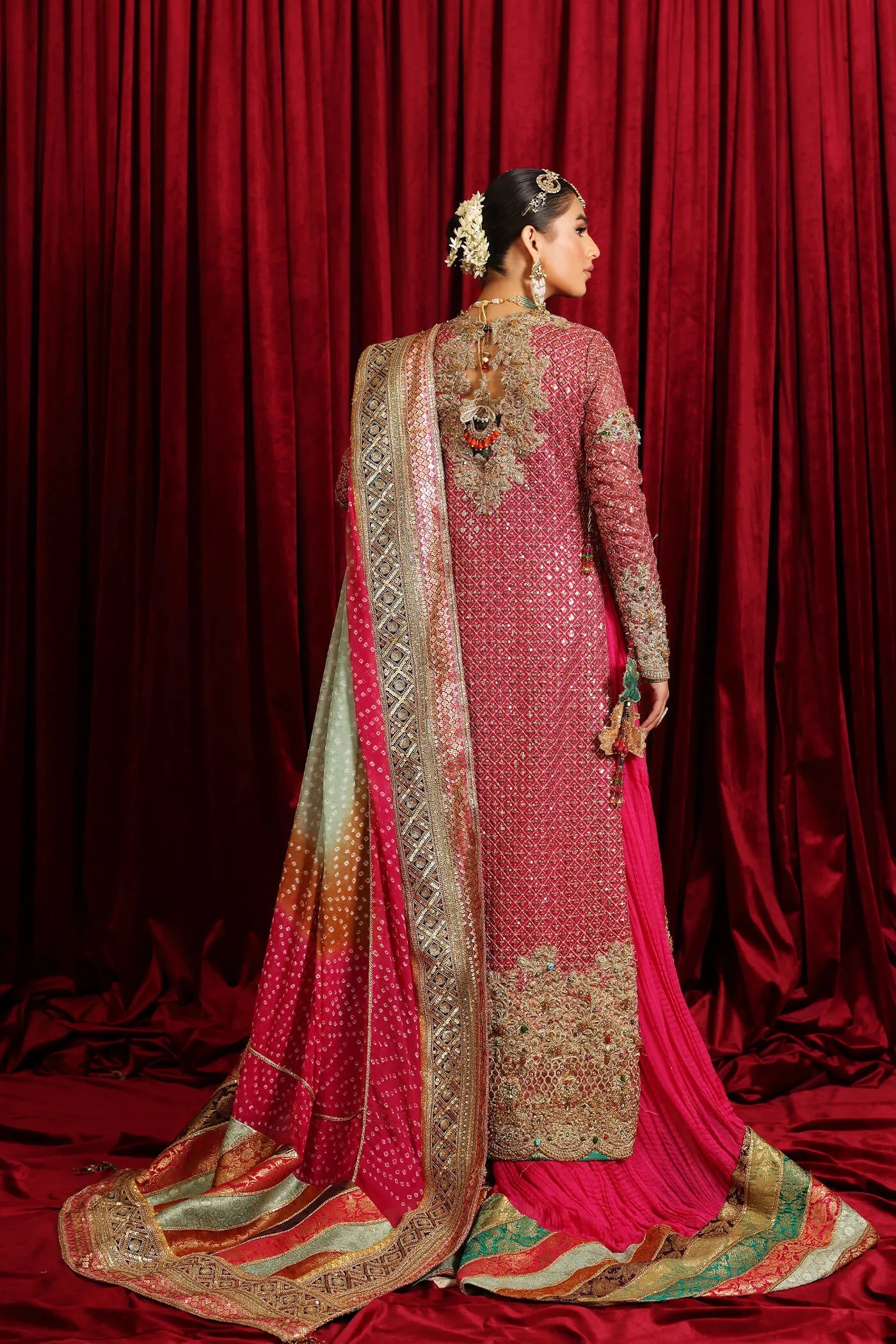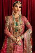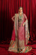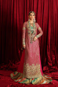 ‘Serene Light’ is the perfect fusion of modern and traditional cuts, our artisans have expertly handcrafted this ensemble. Traditional embellishments, featuring multicolor stones combined with sequins, crystals, and thread work, enrich this luxurious creation. Cast in a gorgeous vibrant pink hue, the meticulous embroideries and hand-embellishments, including a delightful combination of sequins, pearls, and gota work, enhance its beauty. Accompanied by a couture crushed Sharara and a resplendent chunri dupatta in contrasting colors, embellished with Crystal tassels & gorgeous embroideries this ensemble is a genuine work of art!