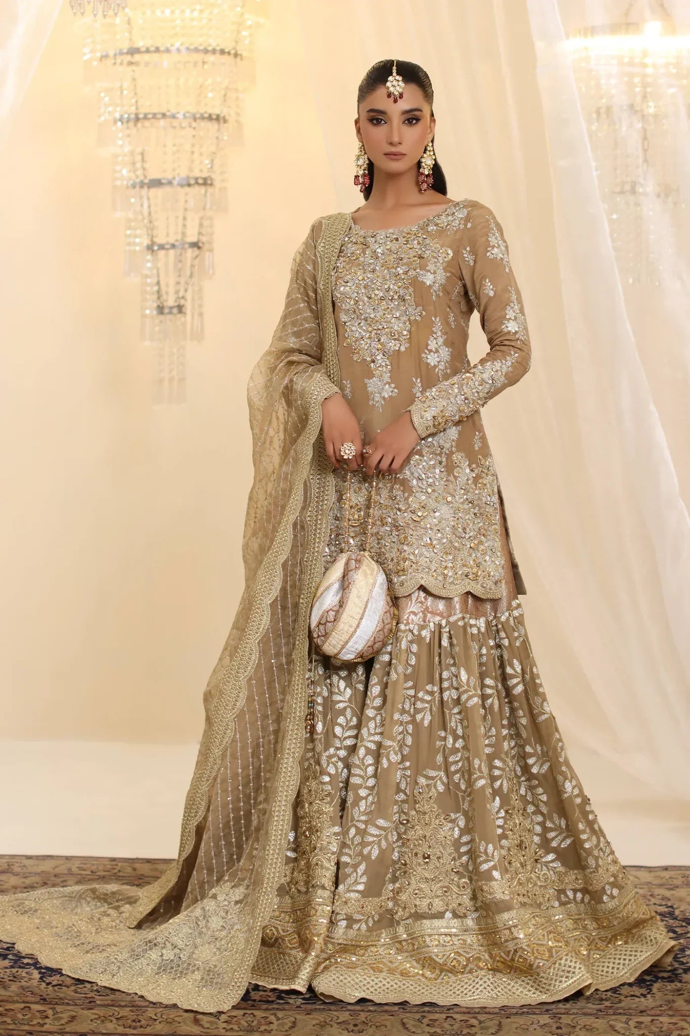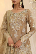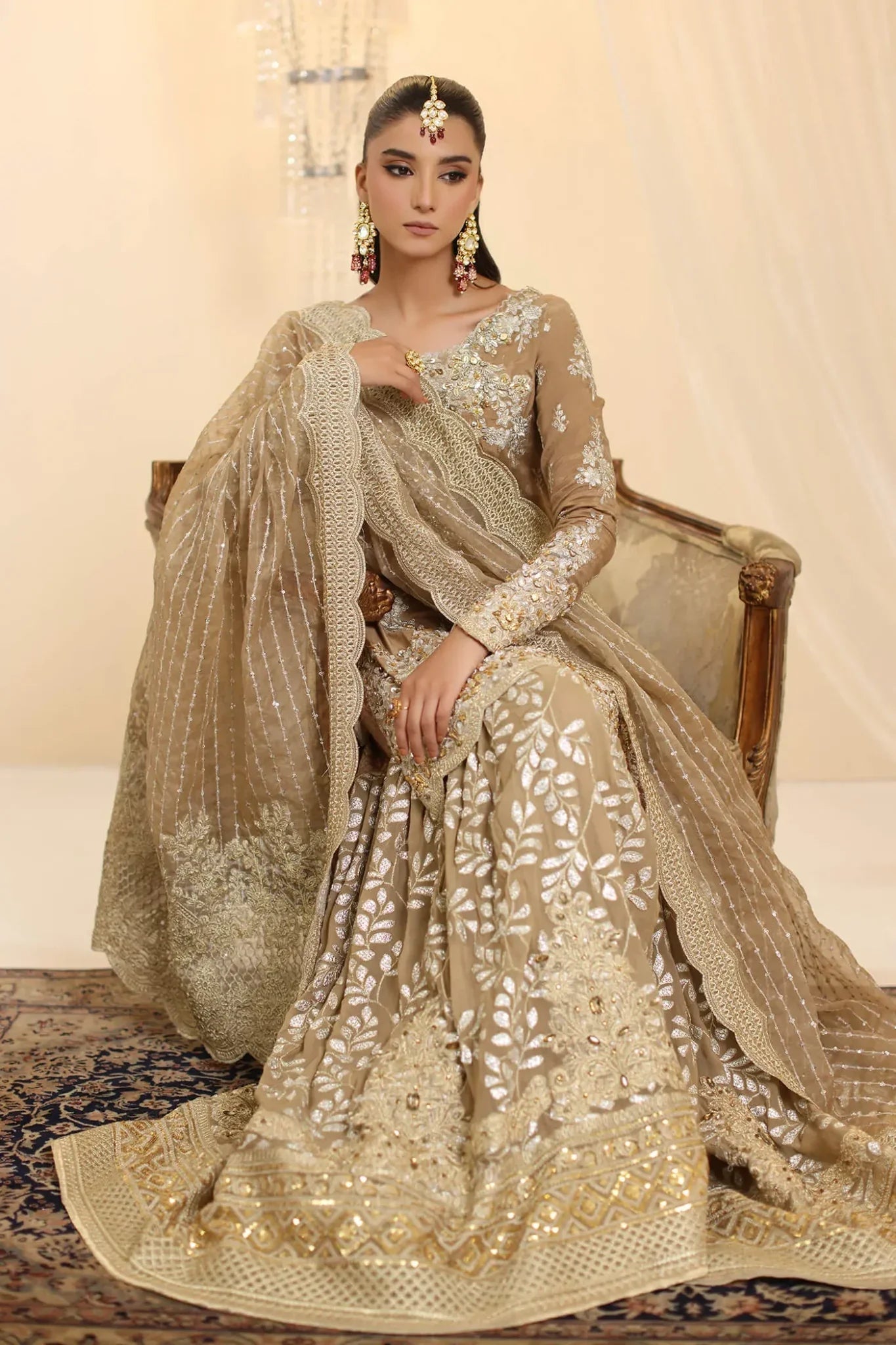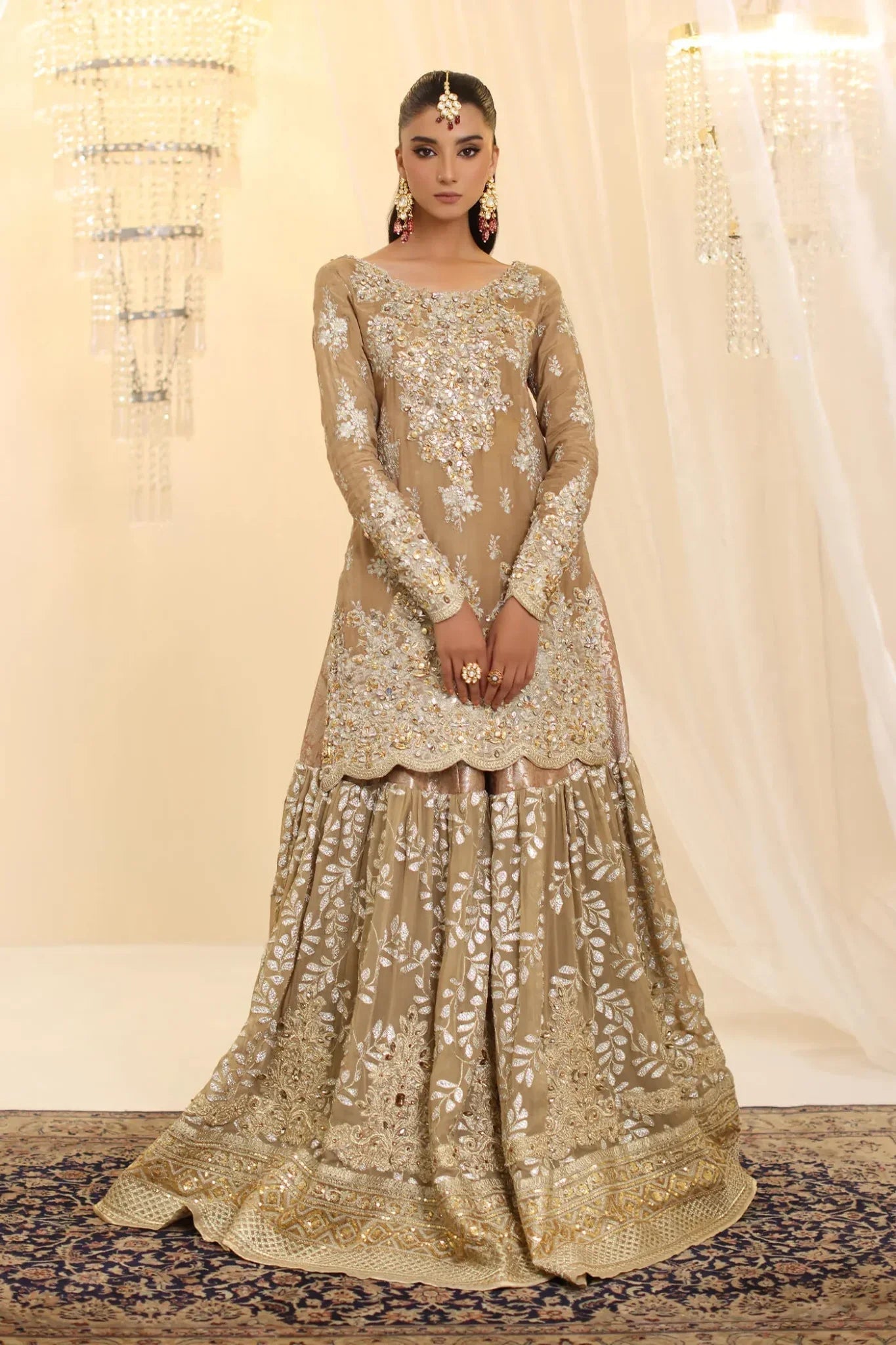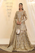 Glamorous & Couture , Sunlit Majesty, features a stunning gold ensemble that masterfully blends gold and silver embroidery, adorned with crystal Swarovskis, pearl drops, and shimmering sequins, making it a true statement of couture & luxury. Paired with an intricately detailed gharara, the outfit exudes a regal charm, while the embroidered organza dupatta, finished with exquisite detailing, completes the look with an ethereal touch. Designed exclusively for those who desire to make an unforgettable statement of timeless elegance.