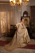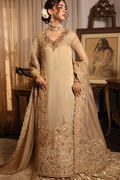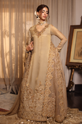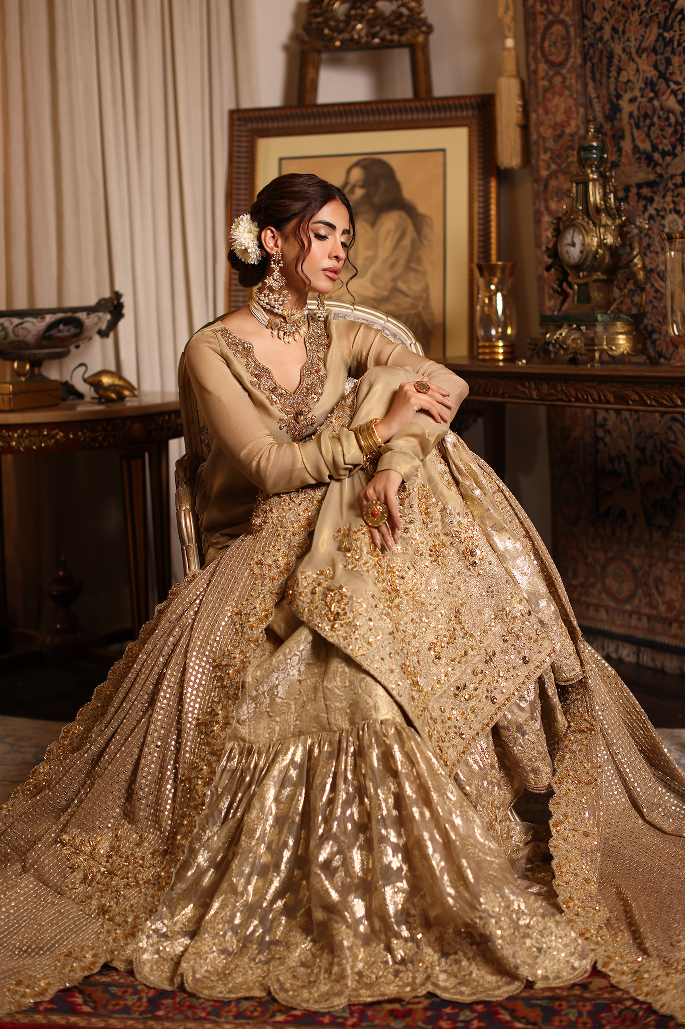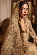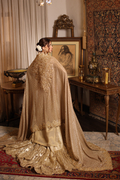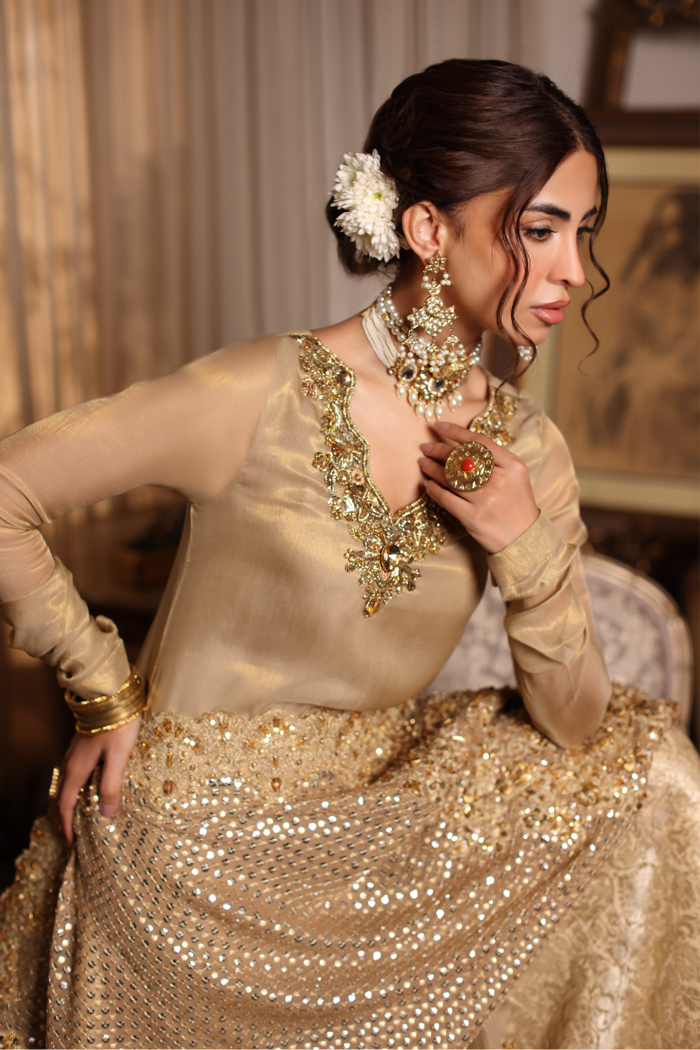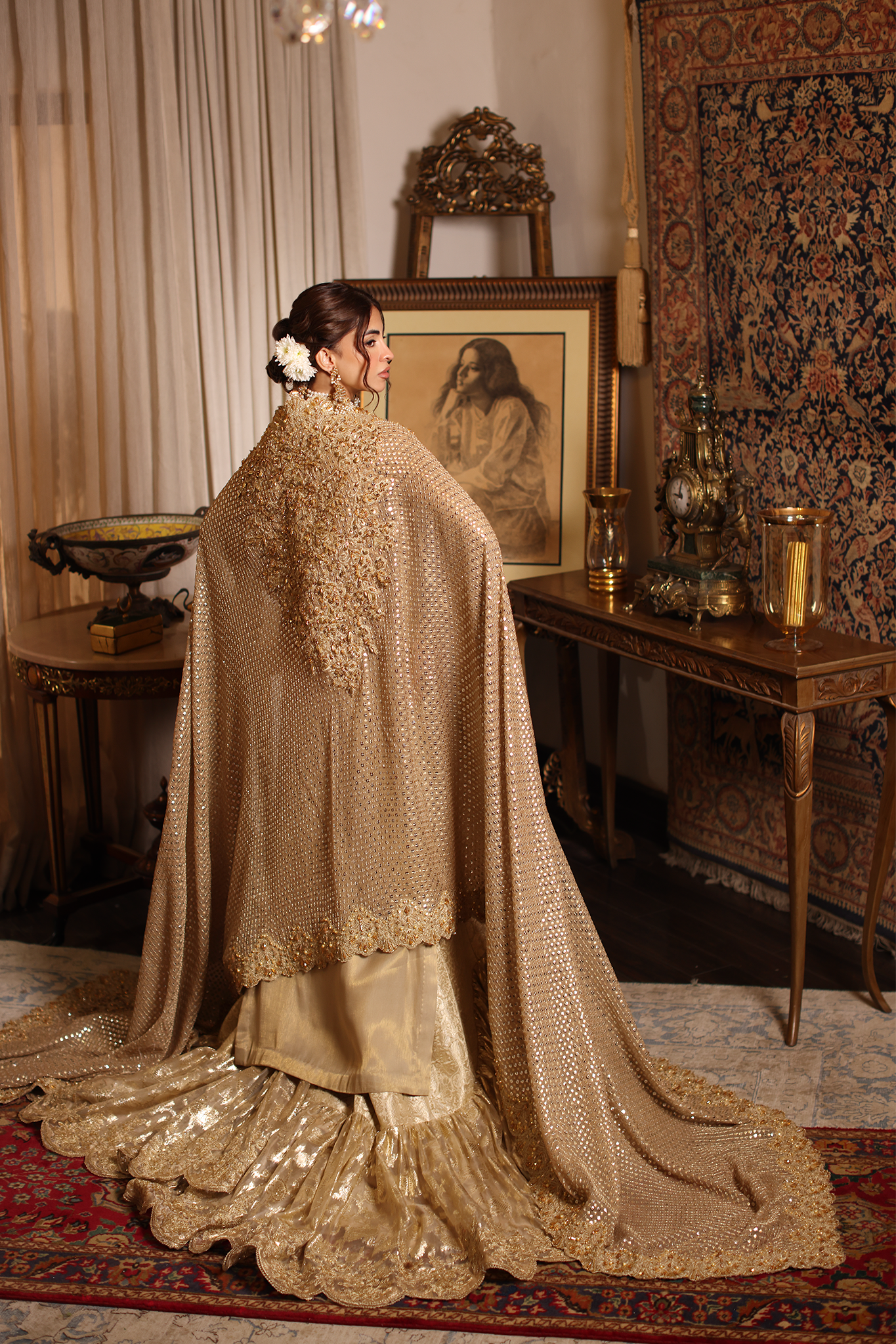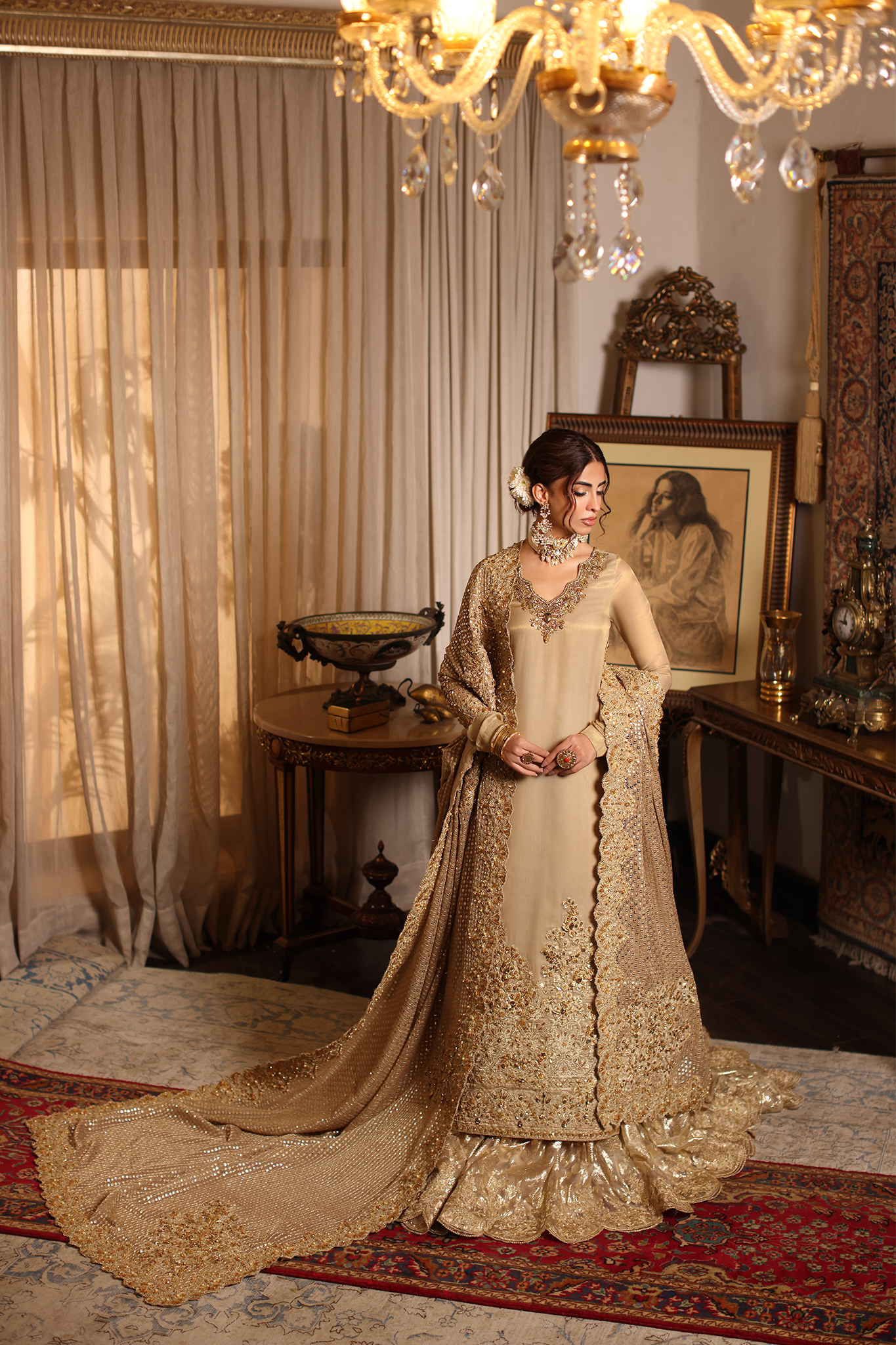 Eternal Solace embodies tranquility and grandeur in equal measure. Crafted in luxurious gold hues, the elongated silhouette flows with quiet strength, accentuated by delicate resham embroidery and fine hand embellishments. Every element, from texture to tone, reflects a deep sense of serenity and timeless sophistication. A creation that whispers calm elegance — effortlessly eternal, unmistakably couture.