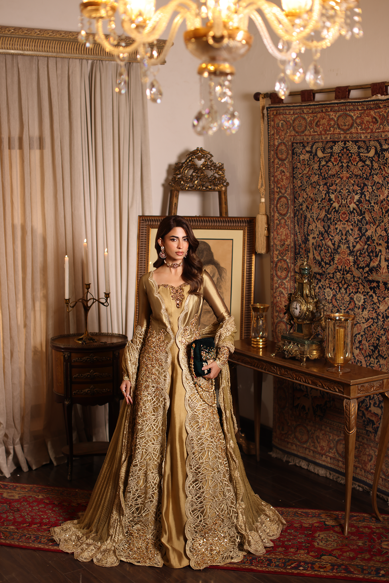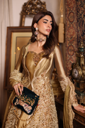 Sunlit Grace evokes the golden warmth of daylight woven into couture. The silhouette reflects refined tailoring with delicate embellishment, blending tradition with effortless sophistication. Intricate gold tilla and resham embroidery illuminate the design, creating a glowing harmony of texture and elegance. Each element, from stitch to shimmer, is shaped through painstaking handwork — a radiant expression of modern regality.