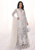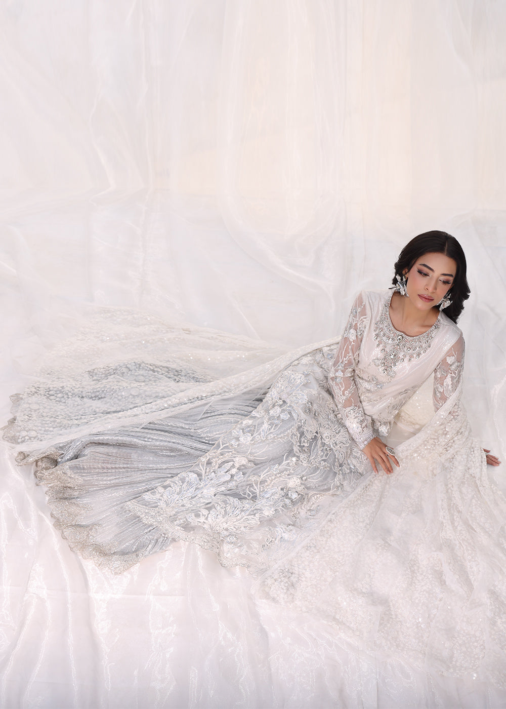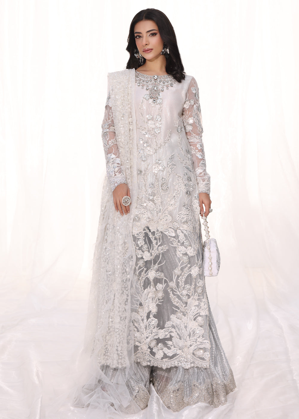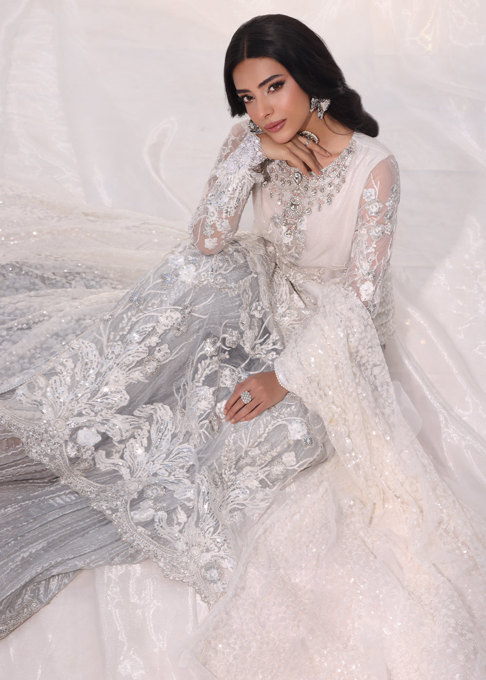 Starlit is a dazzling creation that embodies the elegance of a starlit night, crafted in a luminous silver snow hue. The Ensemble is adorned with intricate tilla and sequin embroidery, while delicate scalloped details add a refined touch. The ensemble is further elevated with handworked 3D embellishments, including shimmering rhinestones and semi-precious gemstones, creating a look of unparalleled sophistication.