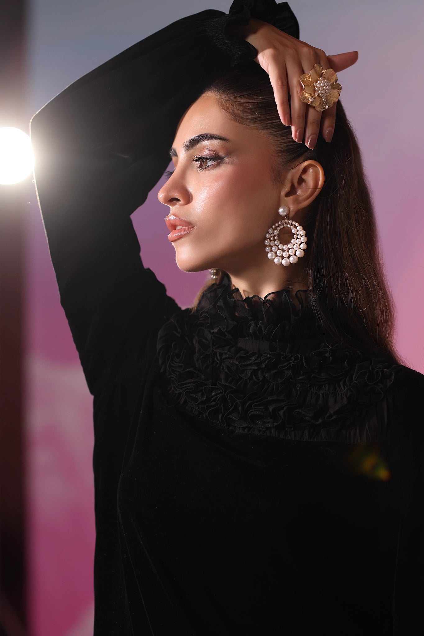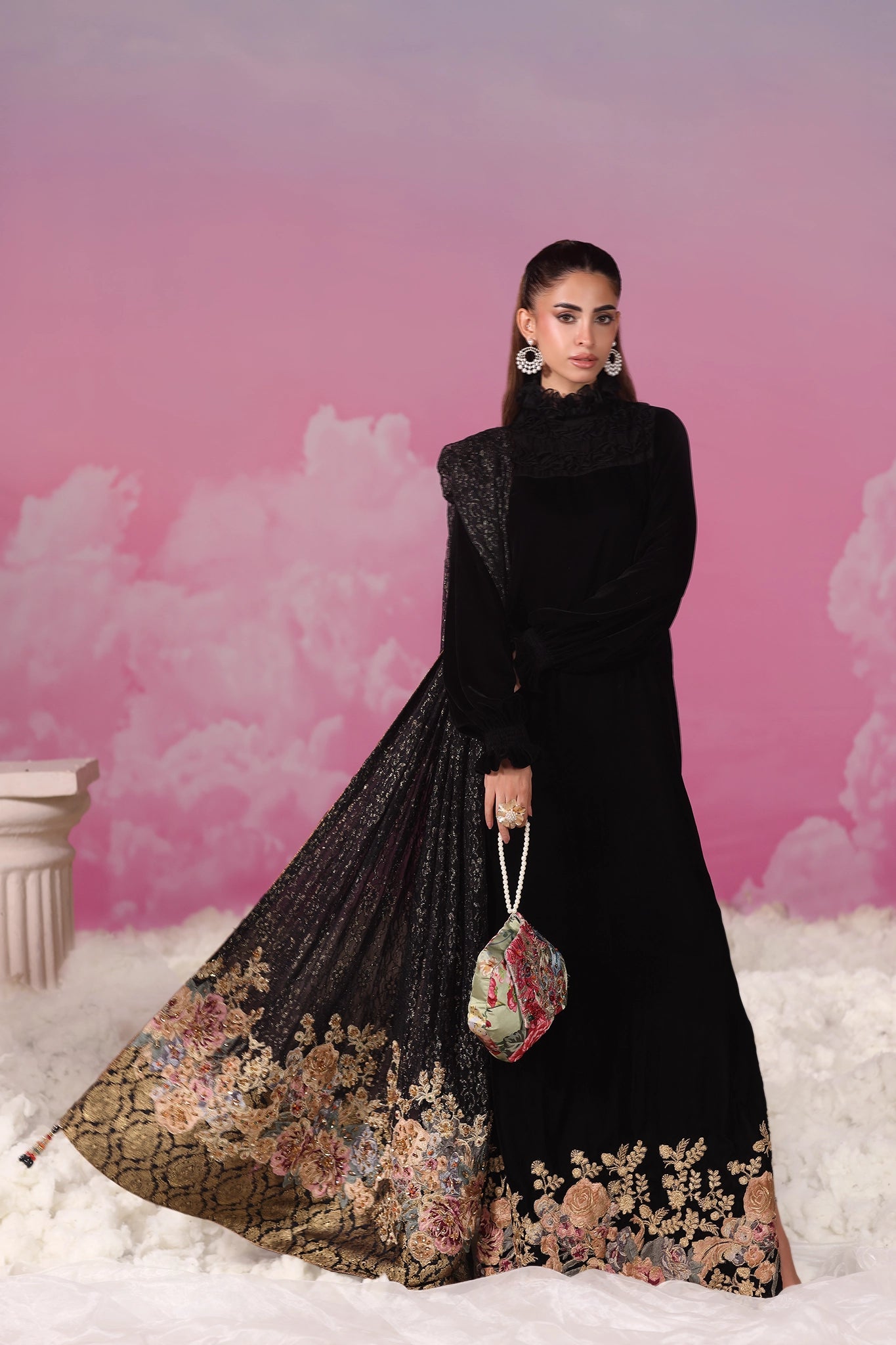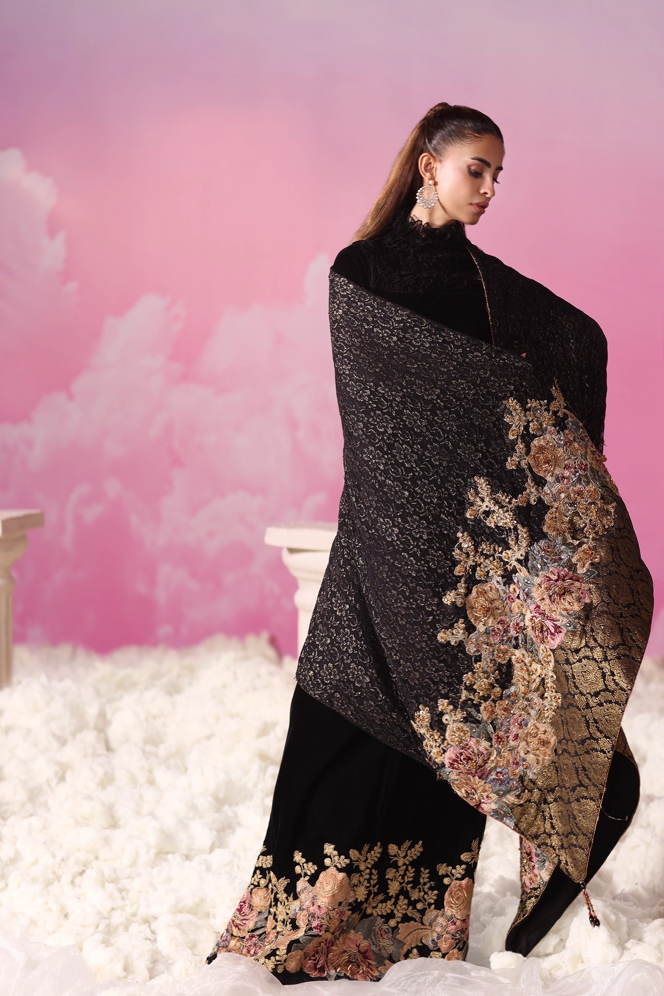 A study in elegance and drama, Noir Blossom captures the allure of black velvet elevated through couture detailing. The kaftan silhouette is refined with a high ruffled neckline, crafted through organza manipulation, and accented with couture shirred elastic sleeves for a modern yet regal touch. A richly worked resham and tilla border anchors the look, blending structure with sophistication.