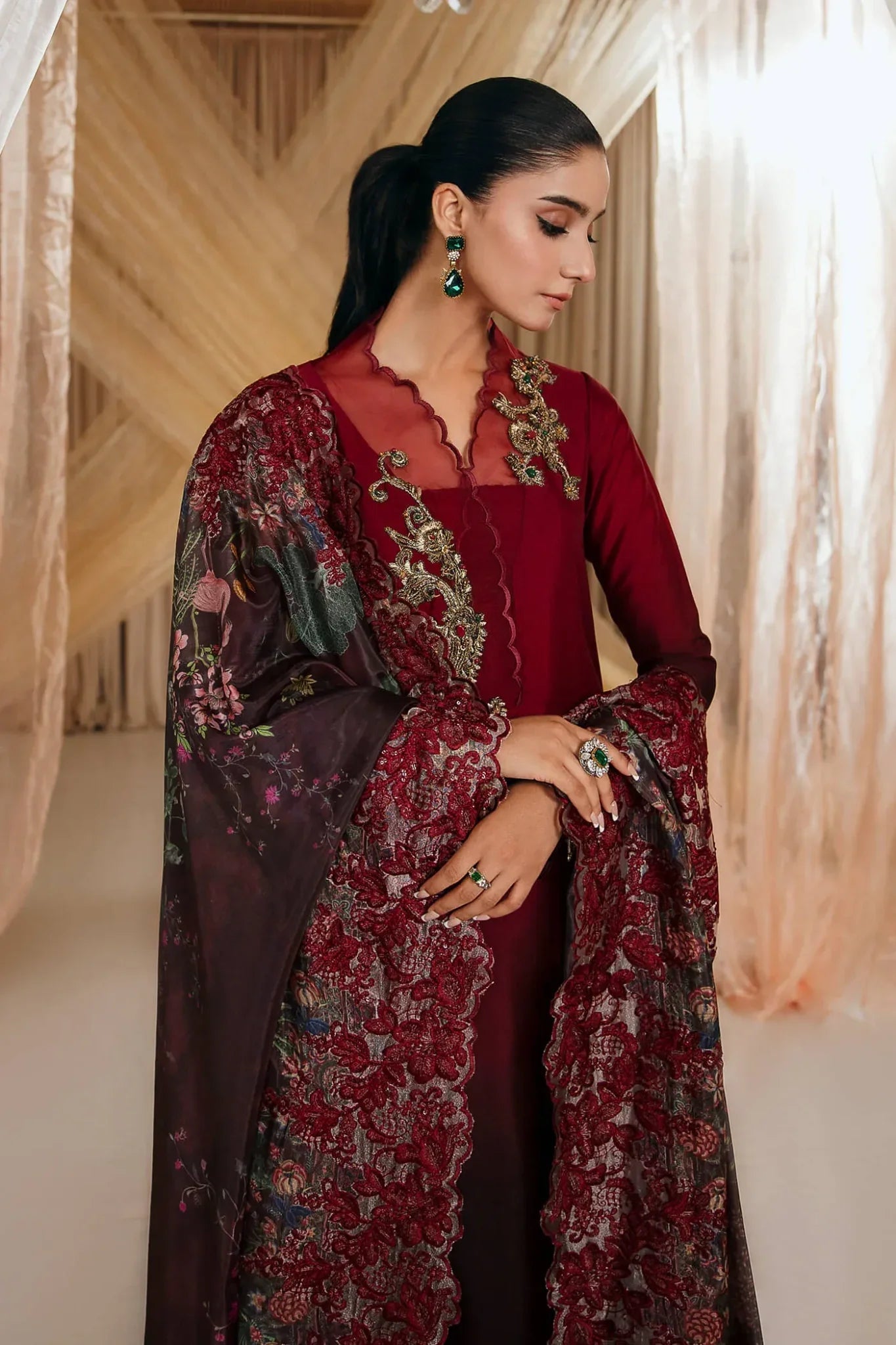 gracefully shades from maroon to black. This exquisite creation is richly adorned with intricate