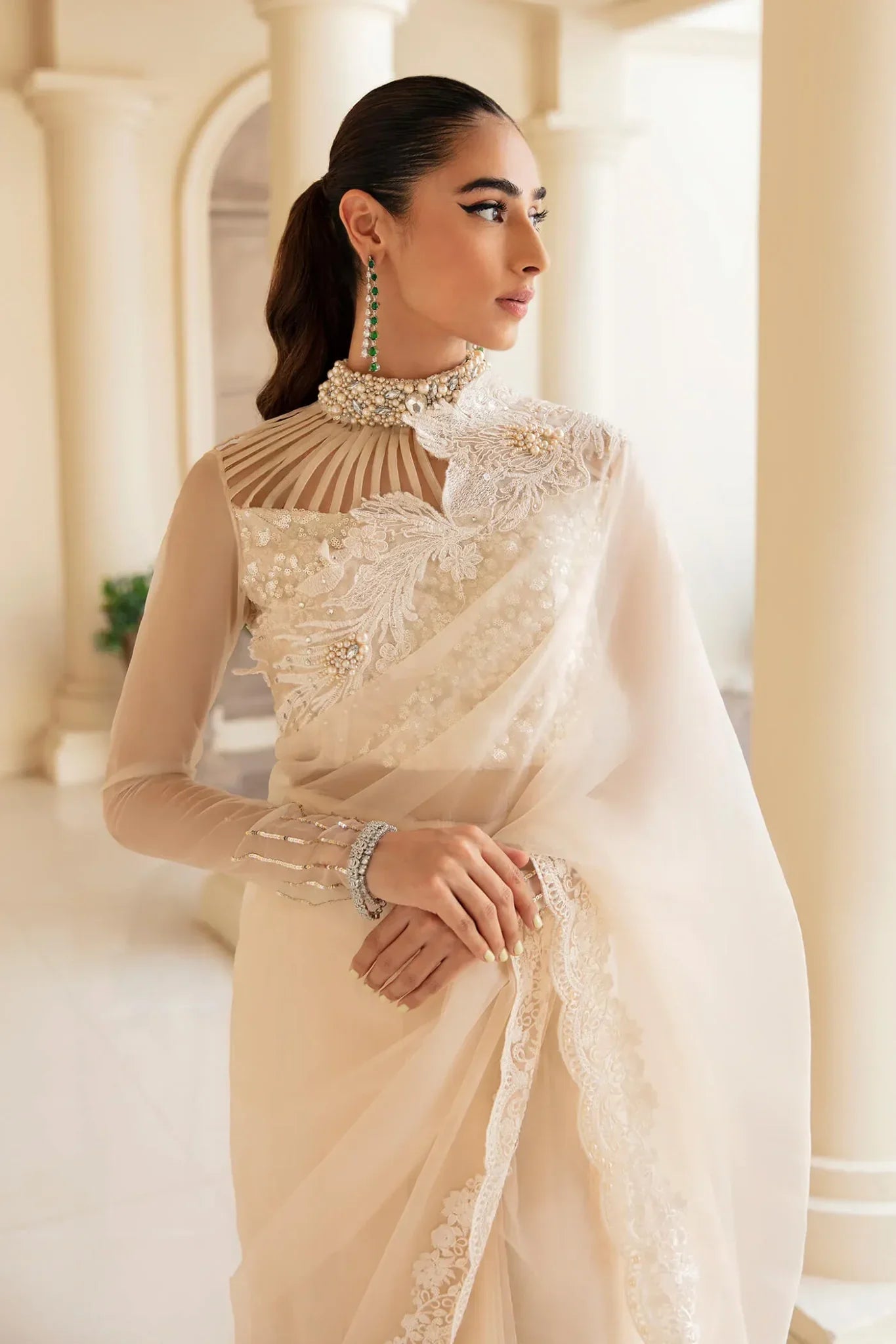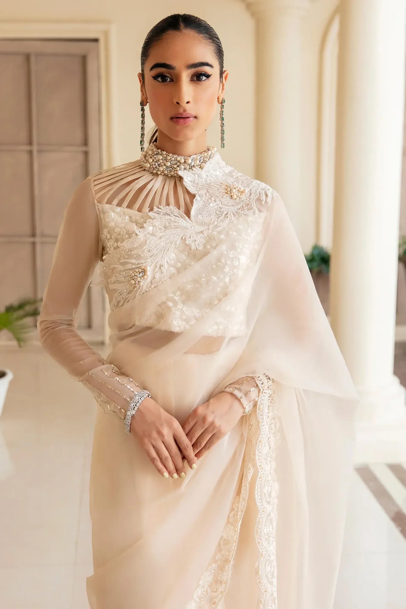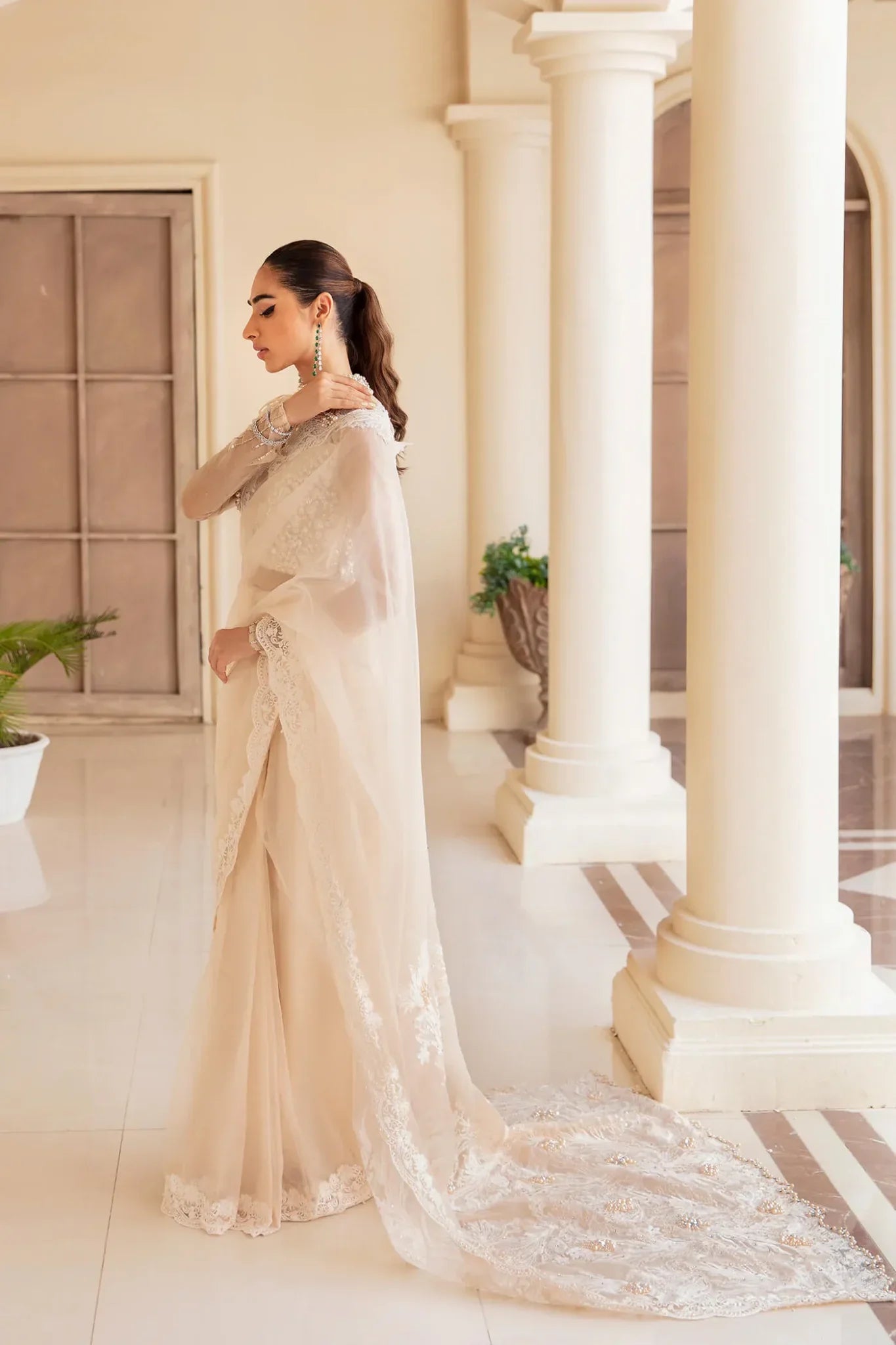 Channel timeless grace in our elegantly draped gorgeous Ivory Saree ‘Celestial Dove’. Delicate floral embroidery is artfully juxtaposed with shimmering beads and intricate 3D embellishments. Complementing this ethereal drape is an exquisitely crafted blouse, adorned with delicate pearl and lustrous sequin detailing. Celestial Dove voguish neckline adds a touch of contemporary elegance, ensuring this ensemble is as mesmerizing as it is timeless.”
