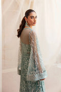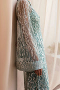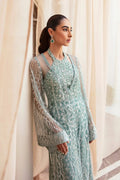 “Lustrous Lumière” is a work of art featuring a chic embellished net floor-length shirt. Evoking a sense of magnificence and refined elegance, this masterpiece is adorned with intricate embellishments and a luxurious Kimkhaab finish which adds a spark to your appearance. Paired with a stylish halter neck blouse and Tinsel Organza Flared pants, “Lustrous Lumière” promises to be the epitome of sophisticated fashion.
