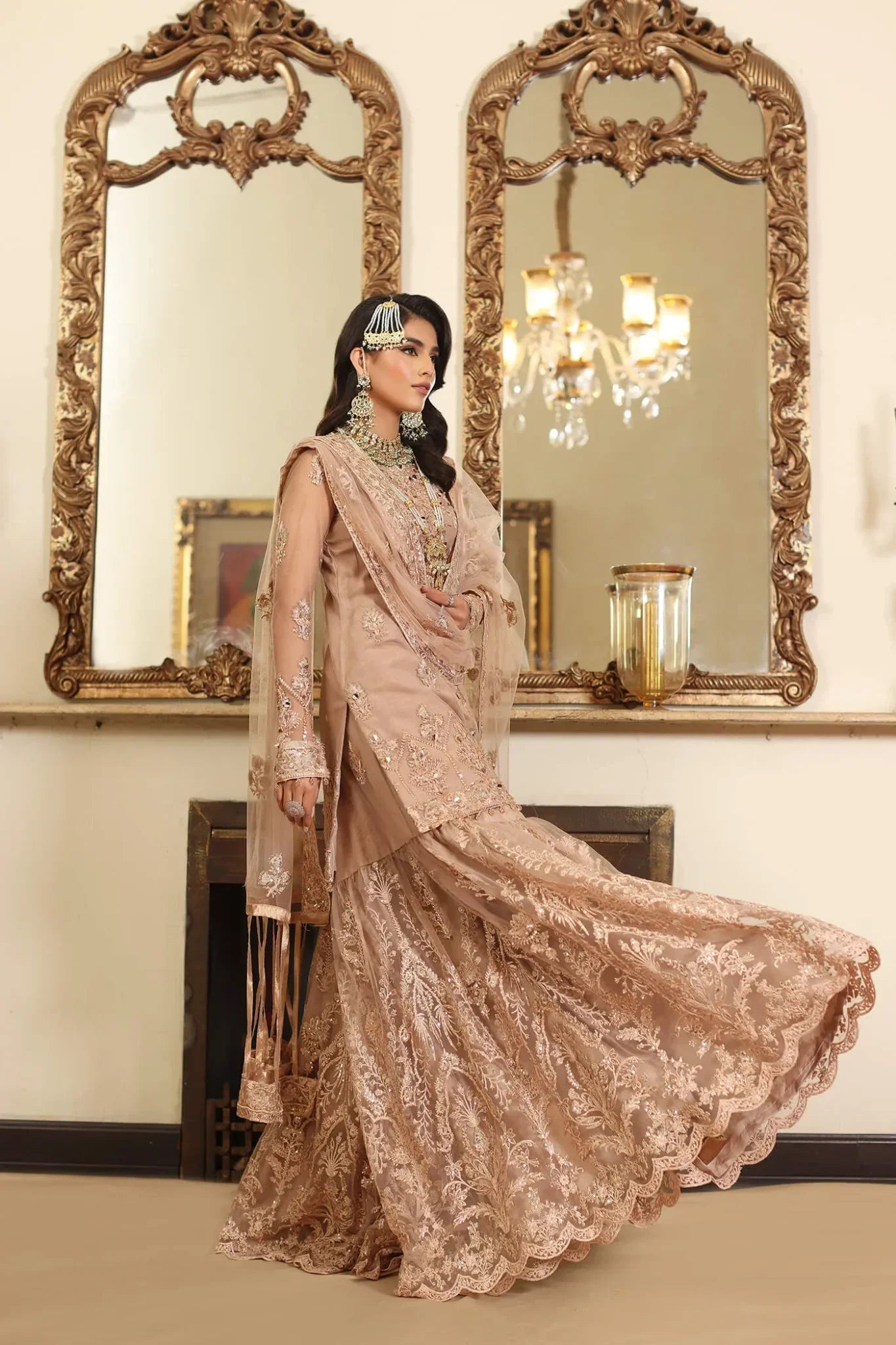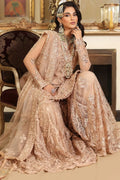 Indulge in the epitome of sophistication in Radiant Rose. The delicately embroidered fabric, in a soft pink hue, sets the stage for a symphony of craftsmanship. Hand-embellished asymmetrical sequins & pearls twinkle like stars, casting a subtle glow that captivates the eye. Intricately hand placed crystals add a touch of opulence, catching the light with every movement. The inclusion of couture pipe design work introduces a modern and structured flair, balancing the ethereal charm of the gorgeous soft pink palette. This Radiant Rose ensemble is not just a Pakistani Gharara; it’s a meticulous fusion of artistry and elegance, a wearable masterpiece that promises to make every moment a celebration of refined beauty.