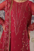 This exquisite ensemble is a true blend of elegance and craftsmanship. The shirt is designed with a deep back neckline enhanced with delicate tassels, while the broad neckline in the front adds sophistication with a graceful depth. The shirt features sequin texture embroidery with an elegant spray pattern, beautifully complemented by full-length sleeves finished with intricate three-inch borders, embellished with hangings for a refined touch. Measuring forty-six inches in length, the shirt is completed with a five-inch border on both the front and back, highlighting timeless detailing. The dupatta is adorned with sequin and embroidery spray, enhanced with a three-inch border and graceful hangings. The sharara, crafted with ten panels of fine embroidery and sequins, measures forty-five inches in length and showcases a wide embellished border, ensuring a regal fall. With every element carefully curated—from sprays to hangings—this attire embodies luxury and sophistication, making it a perfect choice for festive and formal occasions.