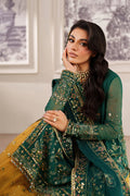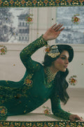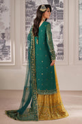 This exquisite ensemble is crafted with meticulous attention to detail. The dupatta is designed in a generous length, adorned with a delicate embroidered and sequin spray, and finished with a finely detailed border on the pallu. The sharara features a flowing flare created with multiple panels, giving it a regal and voluminous look, further enhanced with embroidery and subtle sequin accents along its borders. The shirt is tailored in a graceful length, with borders added to both the front and back, highlighted with embroidery and sequin spray for a refined finish. The neckline is styled with a broad front and an elegant depth, while the back is embellished with intricate embroidery and delicate pearl tassels. Fitted sleeves are detailed with embroidered borders and hanging accents, adding a touch of charm to the design. Every element — from the dupatta to the sharara — is carefully adorned with embroidery, sequins, and finishing borders, bringing together timeless craftsmanship and luxurious sophistication, making it a perfect choice for festive and bridal occasions.