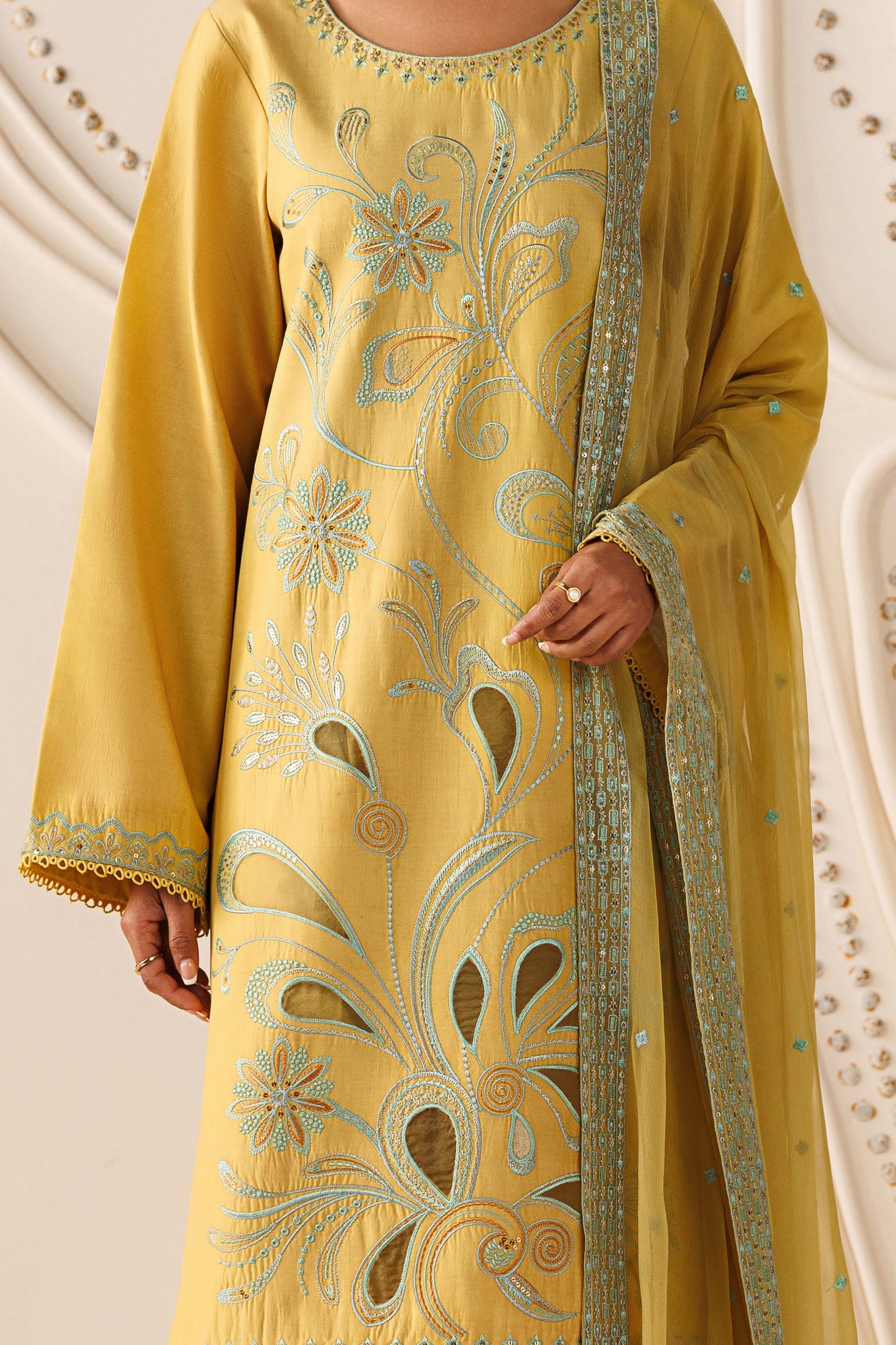The overall stitching appears clean and even, giving the outfit a polished and well-shaped look.The trouser is straight-cut and made from cambric fabric, matching the shirt for a smooth and connected look. The simple cut keeps the outfit relaxed and easy to wear while maintaining a tidy shape. The dupatta is made from crinkle fabric and finished with embroidered borders on all sides. This adds softness and flow to the outfit while keeping the design complete and refined. The yellow color gives the outfit a fresh and lively mood. It feels light, warm, and season-ready, making the overall look simple, balanced, and wearable.This design is part of the Cambre Cambric Cotton Organza collection and also falls under our Casual Pret collection, created for light, easy, and season-ready looks.