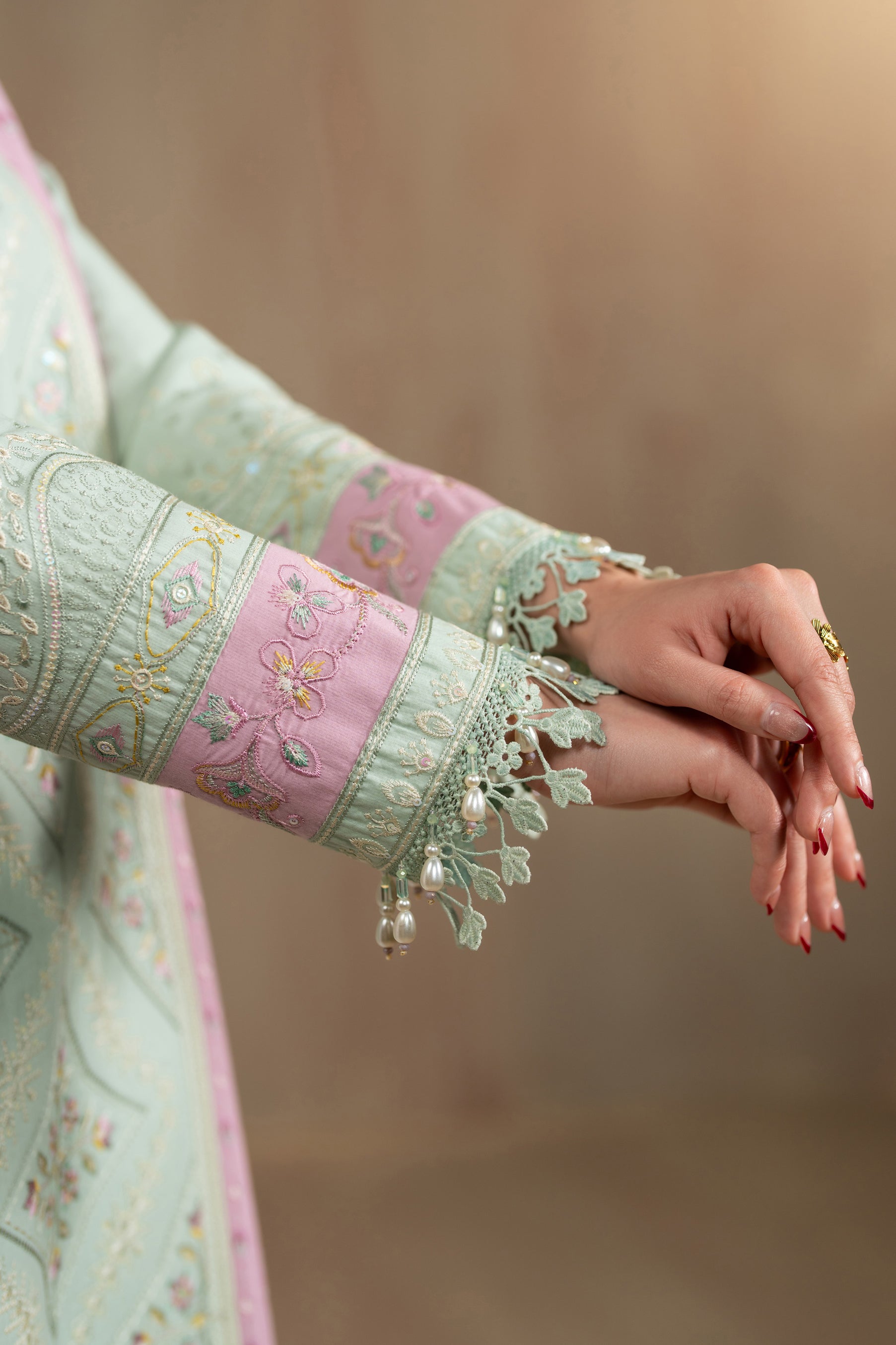 Tazila is a soft summer outfit created with a calm and refreshing appearance. The base shade is light green, which gives a cool and airy feeling suitable for gatherings and small occasions. The color keeps the overall look gentle and neat. The shirt is made in lawn fabric, so it feels light and breathable in warm weather. The shirt is long and straight, giving a modest and balanced silhouette. The front area carries fine white thread embroidery placed in repeated patterns from the neckline down to the hem. Because the embroidery is arranged carefully, the design looks tidy and complete rather than heavy.