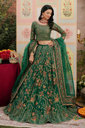 This green festive lehenga choli ensemble is the designer’s pick for your festivities. The choli comprises of round neckline along with heavy sequin work along with hand adda embellishments comprising of kora, dabka, stones, sitari and crystals along with thread embroidery & sequin work. The full fitted sleeves are vibrant with multi-hued embroideries & hand adda embellishments giving ff that festive aura. The back of the bodice is heavily bejeweled with handmade hanging tassels. The lehenga is heavily adorned with heavy hand adda embellishments and thread embroidery along with self-texture play, taking inspiration from Indian floral motifs & festive color palette of reds & yellows. The lehenga is finely finished with line embroidered textures with stone details & minimal lace. The dupatta is adorned with chunky 4-sideed heavy embroidered border with red hues and floral motifs along with embellishments spray in the mid all over.