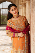 This exquisitely crafted ensemble features a double-head shirt with a delicately designed neckline, enhanced by a graceful keyhole detail. The shirt’s silhouette is refined with elegant hems and sleeves, beautifully finished with contrast borders and intricate appliqué. The sleeves carry an artistic touch with adda, embroidery, and shimmering sequins, bringing a timeless sophistication to the outfit. Paired with the shirt is a luxurious sharara, designed with generous volume through multiple panels, creating a majestic flare. The hemline is accentuated with contrast borders, while handwork details in adda, embroidery, and sequins elevate the overall look. The back mirrors the front with equal finesse, ensuring harmony and balance in design. This ensemble embodies a perfect blend of traditional craftsmanship and contemporary grace, making it ideal for festive and formal occasions.