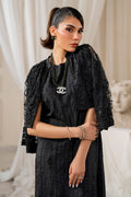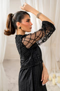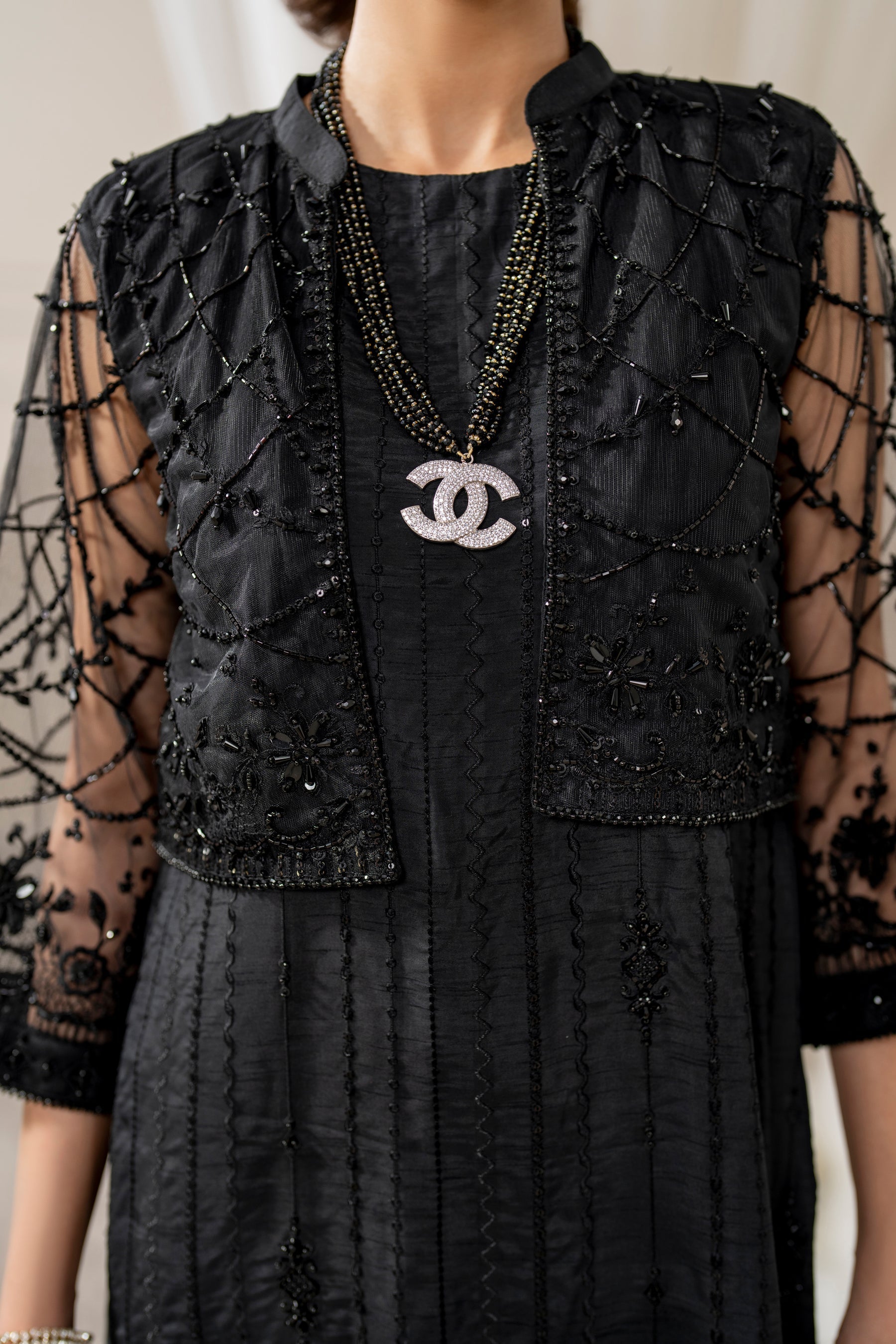 This lustrous black hued ensemble has PK Raw silk shirt adorned with same as base line pattern embroidery & sequin work on front & back. Topped with a hand embellished cropped jacket with geometrical pattern on the front, back & three-quarter sleeves, bejeweled with crystals, bead work, handmade hangings& glamorous sleeve borders. Topped with embroidered dupatta with sequin details, finished with beaded lace, Siara is paired with straight pants.