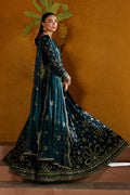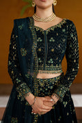 An elegant velvet lehenga set crafted in a rich zinc hue. The bodice features a broad neckline with geometric embroidery and subtle sequin detailing. The lehenga is designed with multiple panels for a grand flare, finished with scalloped embroidered borders and floral motifs. The dupatta, made of net, is beautifully scalloped and sprinkled with delicate sequins for a soft, ethereal touch. Tilla work in contrast adds a royal finish. A timeless festive and bridal statement piece.