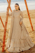 This skin beige layered frock is adorned with intricate hand adda embellishments & handmade hangings on the bodice & sleeves and composed of embroidered motifs, sequin work & patterns to enhance the look. The back is adorned with heavy handmade tassels. Each layer of the frock is bejeweled with composed patterns & floral motifs along with geometrical textures all embedded delicately with embroidery & sequin work, each layer is finished with embroidered & sequin detailed borders. The dupatta is adorned with elegant Mughal-inspired floral motif spray, a 4-sided embroidered border, and sequin work finished finely with minimal lace. The outfit comes with plain straight pants.