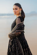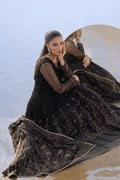 This classic black maxi frock is adorned with a round neckline with pure adda embellishments. The frock is adorned with hand adda embellishments, contrast touches to enhance the look, embroidery, sequin work, handmade hangings on sleeve ends, heavily composed panels, texture play & floral motifs. The back is adorned with handmade heavy tassels. The borders of the frock are heavily embroidered and enhanced with geometrical patterns and hues of red, finished with minimal lace. The dupatta is adorned with heavy embroidery & sequin work jaal in the mid inspired by Islamic motifs & geometrical patterns, finished with a 4-sided embroidered border & minimal lace. The outfit comes with plain straight pants.