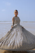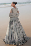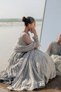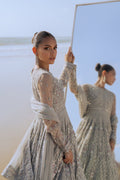 This silver maxi frock has a near to neck neckline & is a showstopper due to its unique color. The composed bodice & sleeves comprise of hand adda embellishments along with embroidery, sequin work, handmade hangings & contrasting hues to give a lavish look. The back of the bodice is adorned with hand embellished mini motif spray. The front and back of the frock is adorned with heavy embroidery & sequin work along with contrasting floral motifs & luxurious borders finished with minimal lace. The dupatta is adorned with embroidery & sequin lines spray & finished with a lustrous embroidered border with sequin & touches of contrast. Valeria is paired with plain straight pants.