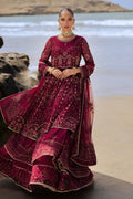 Zurial is the ultimate royalty on burgundy red canvas. This layered frock is maliciously adorned with round neckline & composed bodice. The bodice & sleeves are adorned with hand adda embellishments, embroidery & sequin work along with handmade hangings. The back is adorned with heavy handmade tassels. The first layer of the frock is heavily adorned with embroidery & sequin work with Mughal inspired dome & floral motifs with contrasting touch of orange along with exquisite patterns, finished with embroidered border & minimal lace. The second layer is bejeweled with heavy pattern work with embroidery & sequin, along with Mughal inspired motifs, borders & minimal lace. The final layer is adorned with a lavish embroidered border with sequin work, texture play & minimal lace. The dupatta is adorned with motif spread in the mid & heavy composed motifs on pallu sides, finished with minimal border with the hues of red & orange embroidery details & minimal lace.