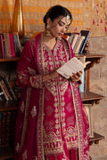 This berry pink A-lined gown is adorned with heavy adda embellishments including including kora, dabka, crystals, sitari, cutdana, tilla, payal, naqshi & heavy embellishment techniques, embroidery. The shirt front is well composed with embellished motifs with zinc contrasting touches along with heavily detailed sleeves with crystal endings. The front mid slit ends with embellished & embroidered border finished with crystal droplets. The back of the shirt is adorned with adda embellished motif spread with embroidery details & border. Outfit is paired with hand embellished sharara with line work details & embroidery finished with heavy border. Outfit is topped with heavy dupatta with embroidery & sequin detail along with mid motif spread and heavy two-sided pallu finished with four-sided border with lace & facing.