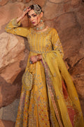 This voluminous ensemble is adorned with heavy adda embellishments including kora, dabka, crystals, sitari, cutdana, tilla, payal, naqshi & heavy embellishment techniques, embroidery on front, sleeves & panels along with blush pink contrasting Indian raw silk applique along with touches of orange & pista. The back is adorned with adda embellishments, embroidery, stylized keyhole, patterns & heavy handmade tassels. The frock border is adorned with base filling pattern & a touch of contrasting hues. Adeen is topped with embroidered dupatta with sequin work & four-sided border along with contrasting applique mid motifs pattern. Outfit comes with straight pants with lace finishing. Outfit comes with hand embellished potli bag.