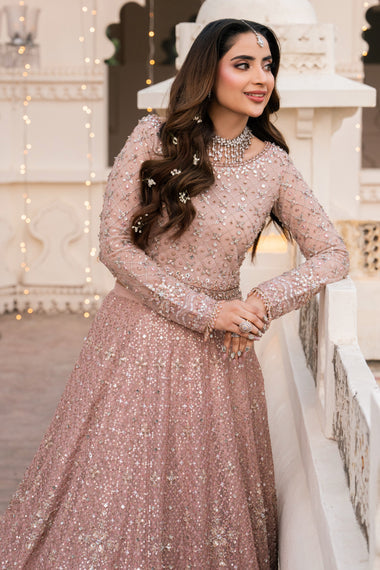 The net dupatta completes the outfit with side borders and added surface work, bringing balance and lightness to the full look. With its lilac tone, detailed finishing, and flowing form, Anzish reflects NAQSHI’s approach to formal wear that feels refined, well-planned, and ready to wear for special occasions.