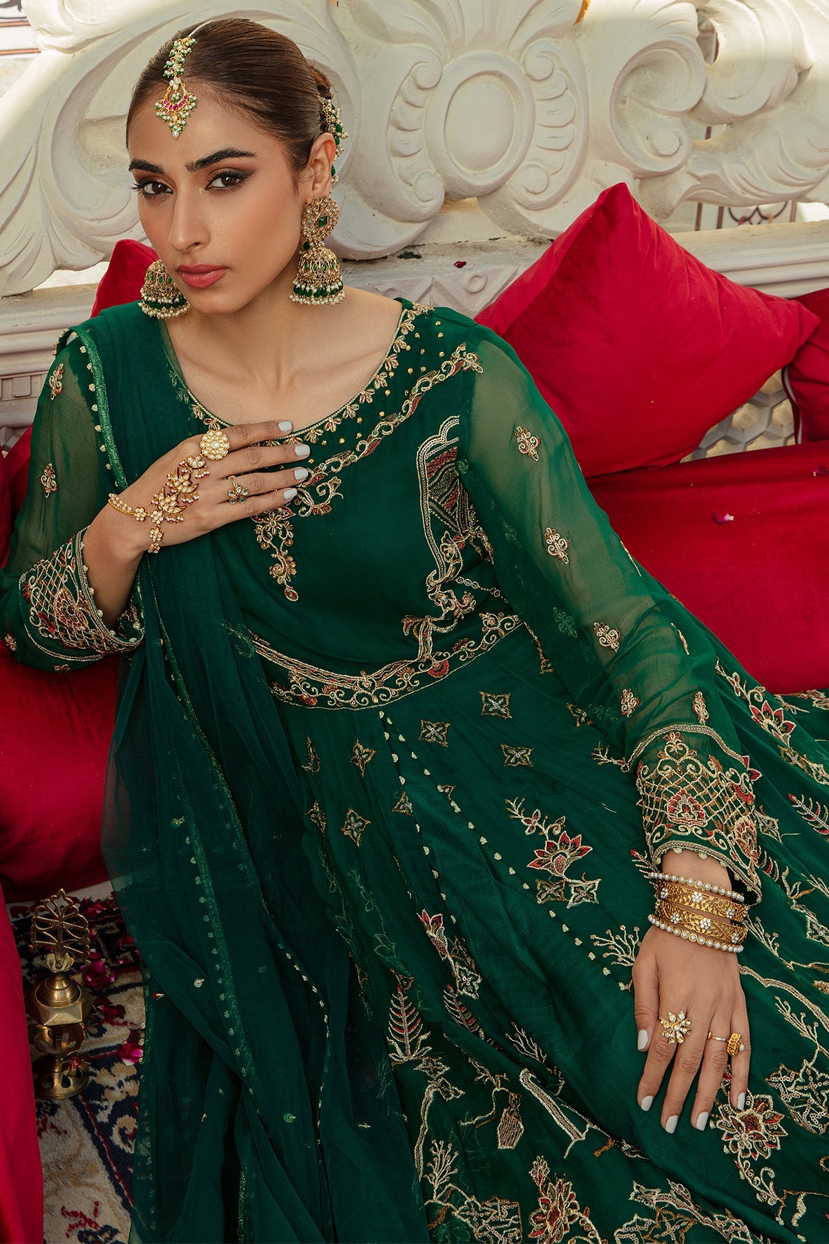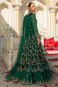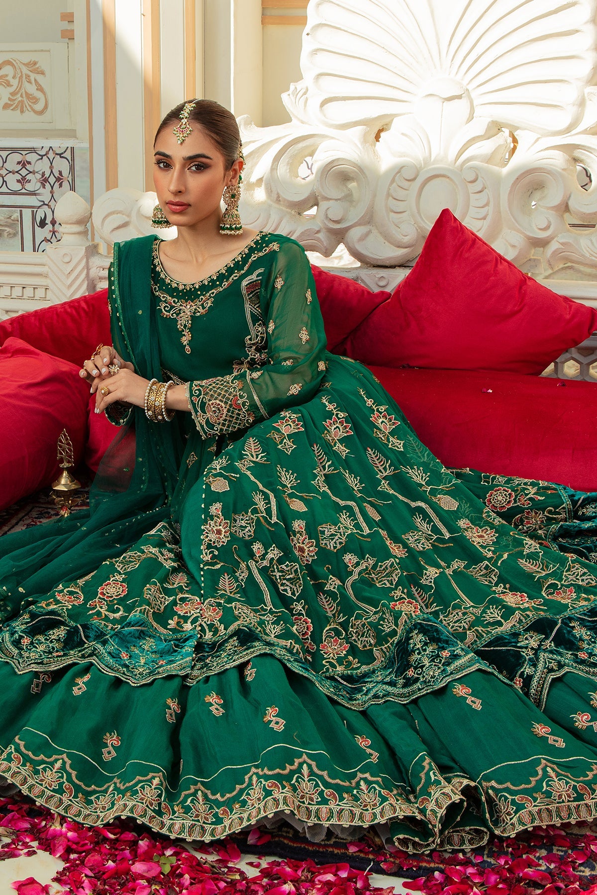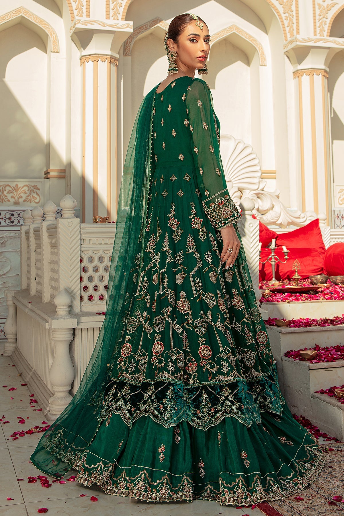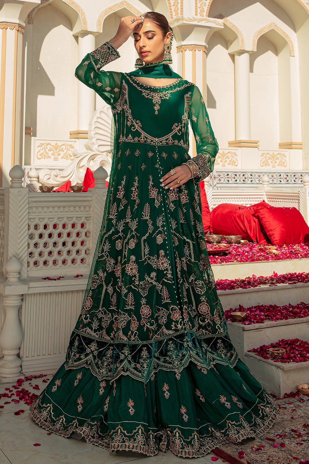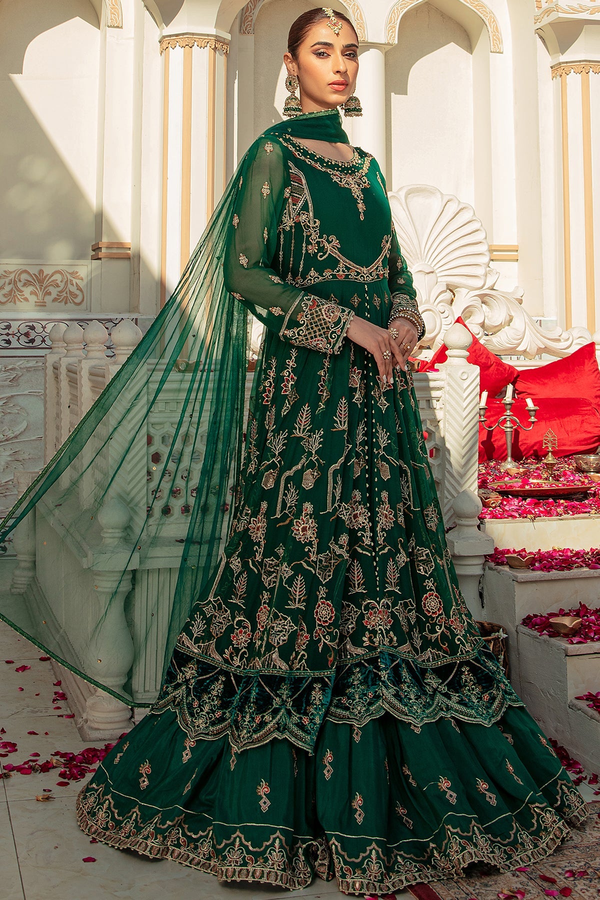 Details: Luxe Craft is majestic emerald green voluminous 2 piece attire with fitted bodice embroidered and handcrafted in embellished details of adda work, tilla, sitari and sequin work with velvet patches edging the sleeves and maxi borders. Attached with heavily embroidered crinkle panels with open slit adorned with heavy embroidery with attached Pakistani raw silk inner. It’s finished with embroidered twirly gathers achieving a beautiful flared look ending with adorned velvet border topped with a mesmerizing net dupatta with sitari spray.