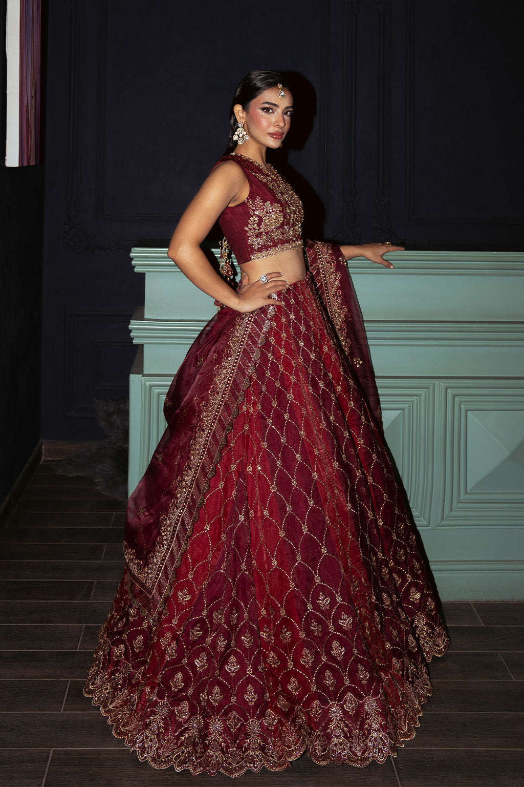 • EMBROIDERED DARK-RED ORGANZA KALIAN.(10-PIECE)