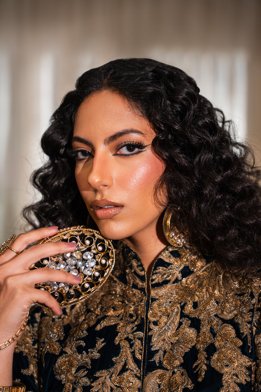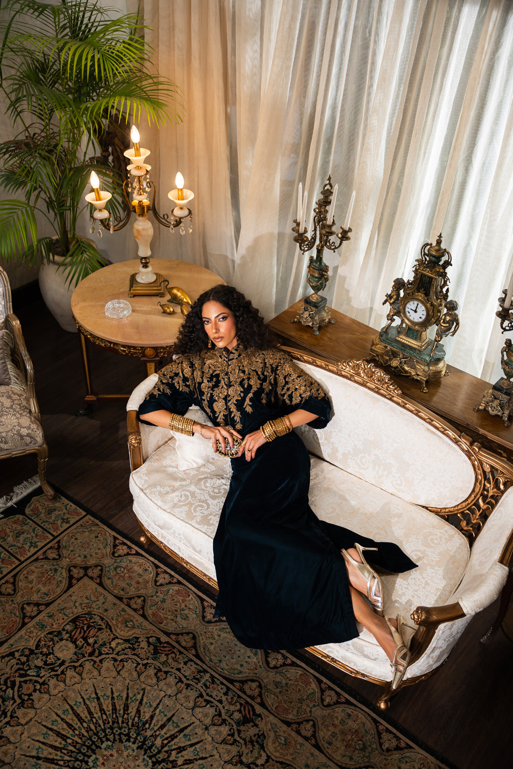 The “Afsana” is an opulent pure velvet kaftan that seamlessly blends timeless elegance with rich cultural heritage. Crafted from the finest velvet, the fabric offers a soft, sumptuous feel, draping effortlessly to create a silhouette that exudes sophistication. The kaftan is adorned with exquisite Persian-inspired embroidery, showcasing intricate floral and geometric patterns that speak to a legacy of craftsmanship. The embroidery, done in rich, contrasting threads, adds depth and texture, creating a stunning visual contrast against the velvet fabric.