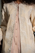 Beneath the jacket, the inner garment is crafted from pure chiffon in a soft nude pink shade, chosen for its gentle, calming tone. The inner’s minimal stitching details and exquisite fabric manipulation techniques—such as gentle pleating or draping—highlight the craftsmanship while maintaining an effortless, fluid look.
