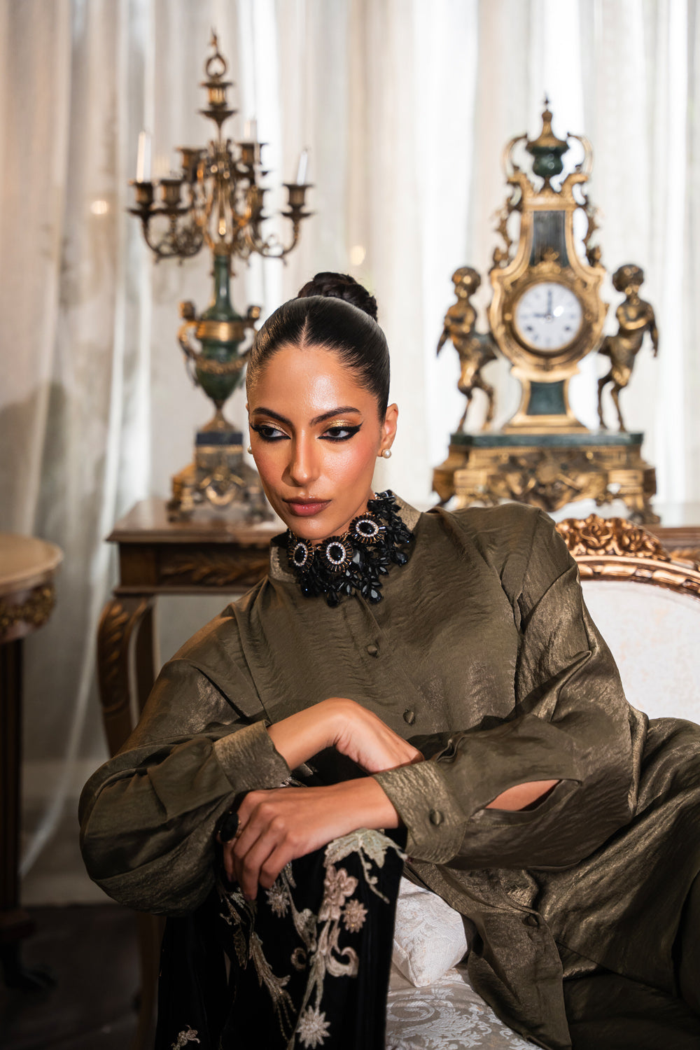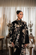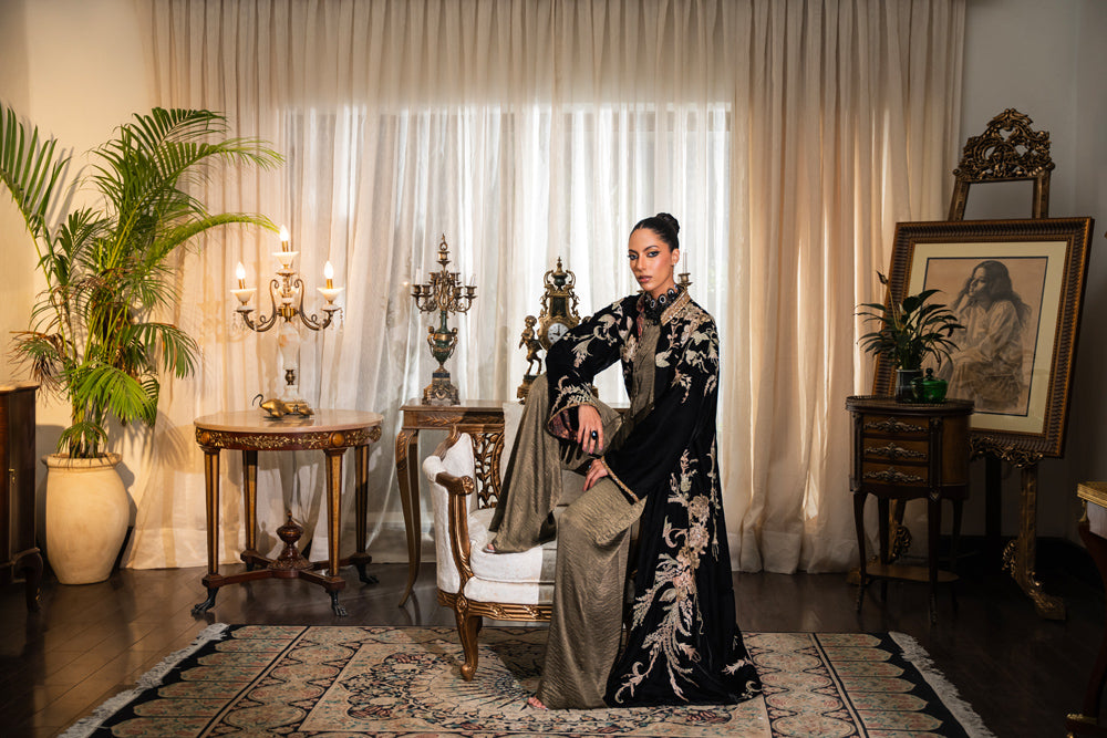 “Zaib” the outfit features a luxurious pure velvet jacket adorned with heavy embellishments on the band and sleeves, intricately detailed with crystals and stones. The ensemble is beautifully complemented by a tie-dye heavy embroidered inner and matching pants, all crafted from pure velvet silk fabric that showcases minimal stitching details for elegance. The jacket’s printed lining, made from chamouse silk, enhances the overall design, creating a striking and cohesive look with a strong composition.