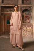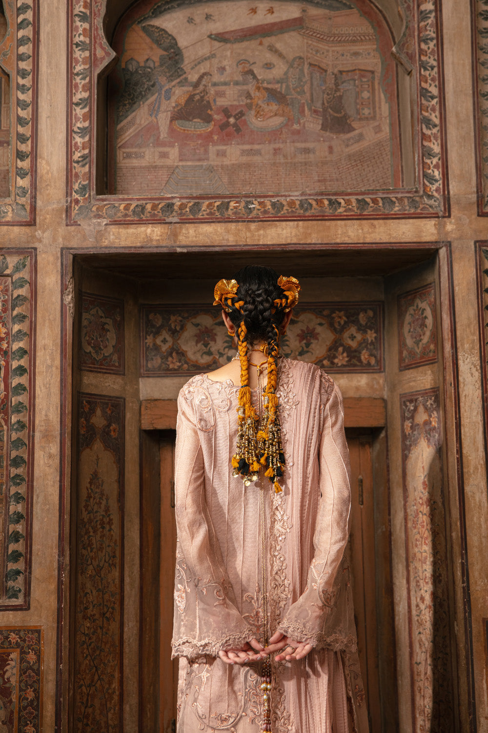 The “ANAIA” ensemble, featuring a delicate palette of tea rose, dust storm, and rosewood tones, is a breathtaking display of craftsmanship. Its embroidered cotton net fabric showcases pin tucks pleated panels adorned with silk thread embroidery, creating a true work of art. The complete organza border with embroidery adds an ethereal touch to the ensemble. The crushed crinkle chiffon dupatta boasts embroidered borders that perfectly complement the embroidered double-layered sleeves and bodice. “ANAIA” stands as a testament to timeless beauty and the artistry of classical elegance.