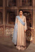 “NYRAH,” a beige shirt meticulously crafted from delicate embroidered cotton net fabric and adorned with exquisite Artisan Adda work. The shirt features Mughal floral motifs that gracefully dance across the front, meeting a scalloped hemline with intricate embroidery and trims. The light dot net dupatta, in dual tones of beige and blue, showcases traditional motifs and embroidered scalloped borders, elegantly finished with beautiful trims. Paired with pearl silk trousers that boast elegant embroidery along the hemline, this ensemble is a perfect choice for Eid celebrations.