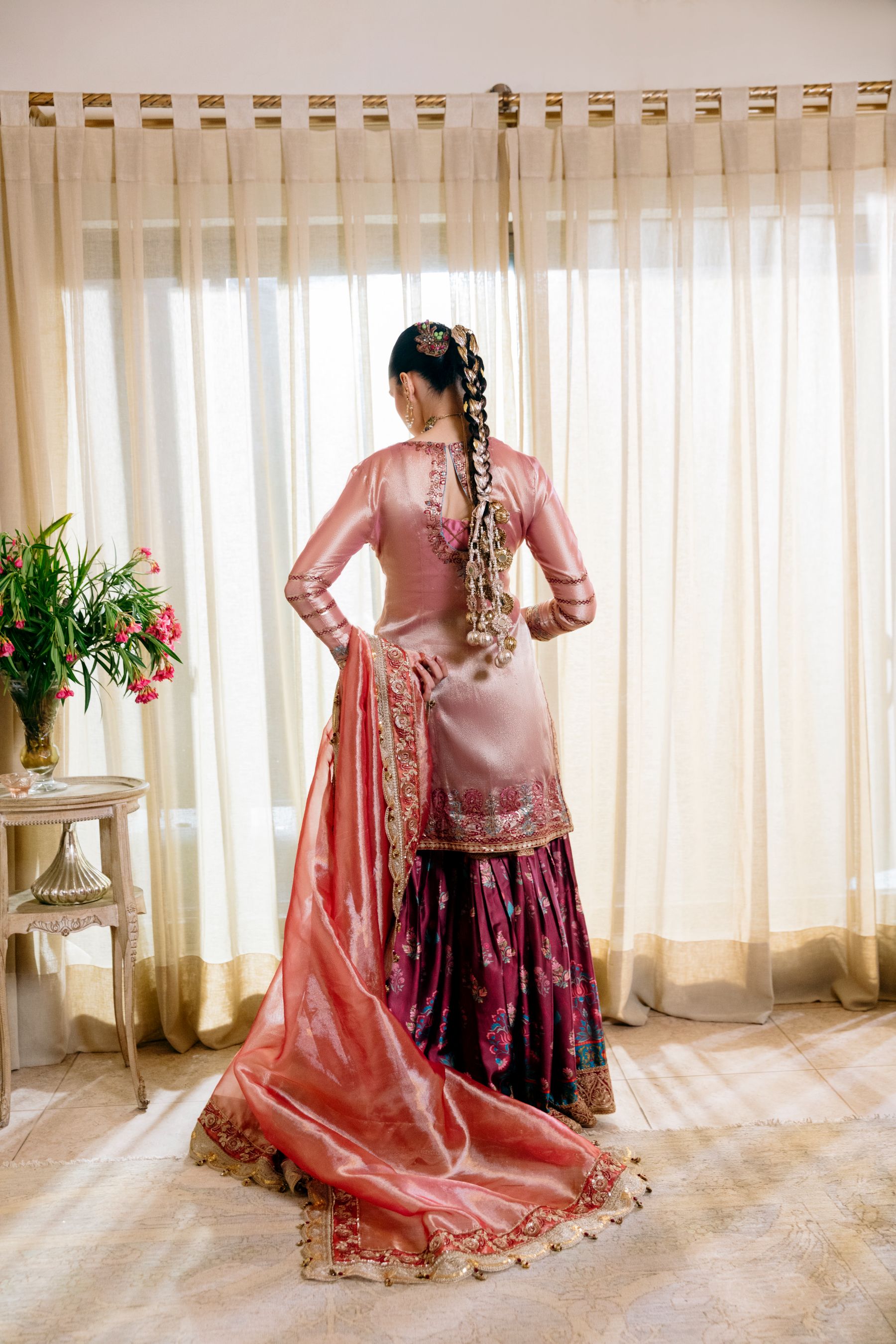 Balancing the look is a sheer coral dupatta, framed with ornate gold embroidery and finished with delicate tassels. Draped with effortless flow, it adds both softness and grandeur, completing the timeless yet festive aesthetic of this set.