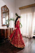 Whispers of the Heart is an ode to eternal romance, crafted in deep crimson and illuminated with meticulous handwork in burnt gold. The flowing silhouette features a flattering flare, where sequins, zardozi, and threadwork cascade seamlessly across the fabric, capturing the grandeur of tradition.