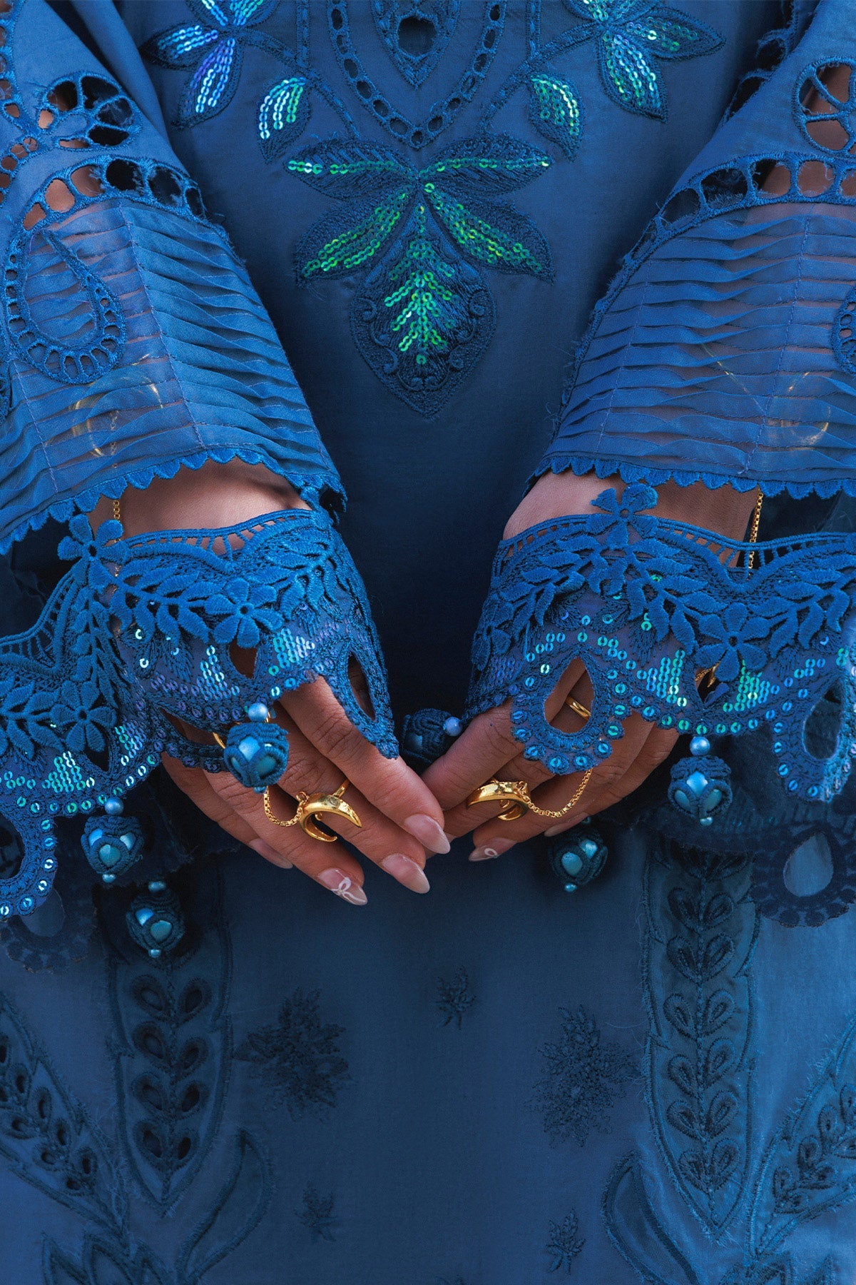 Given our Pakistani cultural background, we understand the significance of modesty. Therefore, we may make adjustments to certain design elements for modesty reasons. Examples of modifications include transforming low backs into traditionally styled regular backs, replacing drop shoulders with normal shoulders, concealing exposed stomachs, and attaching sleeves to sleeveless dresses.