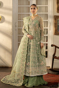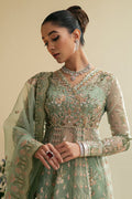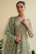 Luxury dancing on the canvas of ARYA, an exquisite creation in a stunning mint green hue. The ensemble boasts an organza pishwas, raw silk trousers, and an embellished organza dupatta with charming borders. Adorned with a rich tapestry of pearls, dabka, kiran, stones, Tilla, and threadwork, this attire is a celebration of finesse and grace.