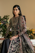 NAQSH stands out with its understated elegance, featuring a versatile black canvas adorned with tasteful pink and silver threadwork. The organza shirt and raw silk sharara pants exude a subtle yet distinct sense of luxury. Meticulously crafted pearls and stones add a touch of sophistication, elevating the ensemble to a delightful creation perfect for memorable occasions.