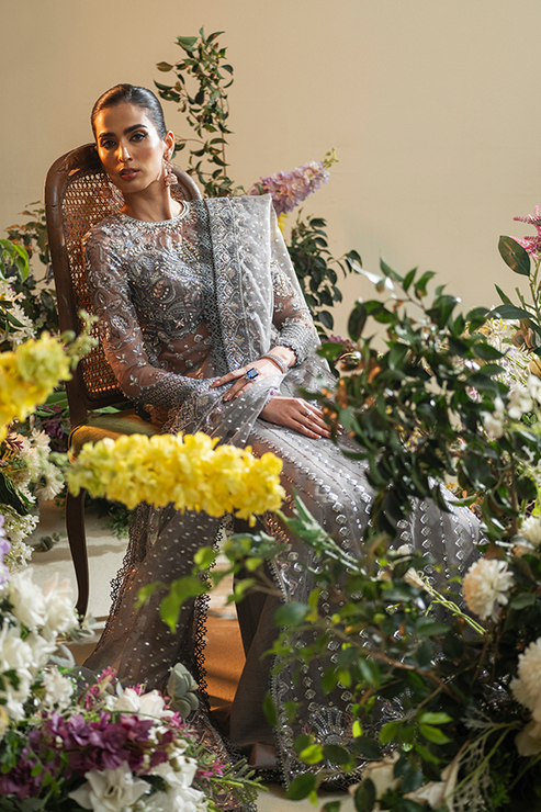 Shayna, a fascinating masterpiece from Nyra's luxury collection in captivating shades of grey and black. The organza shirt features a mesmerizing back neck design adorned with pearls and stones enhanced with an intricate masterwork. Paired with raw silk trousers and complemented by an ethereal organza dupatta, this heirloom piece from the renowned collection seamlessly merges elegance with opulence.
