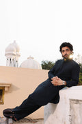 Classic navy blue ensemble crafted with refined stitching details for a sharp, polished look. Designed with double cuffs and a distinctive double ban collar featuring a subtle single stitch accent. The front-buttoned style enhances its structured appeal, while the matching waistcoat is finished with elegant golden buttons and two front flap pockets, adding both sophistication and functionality.