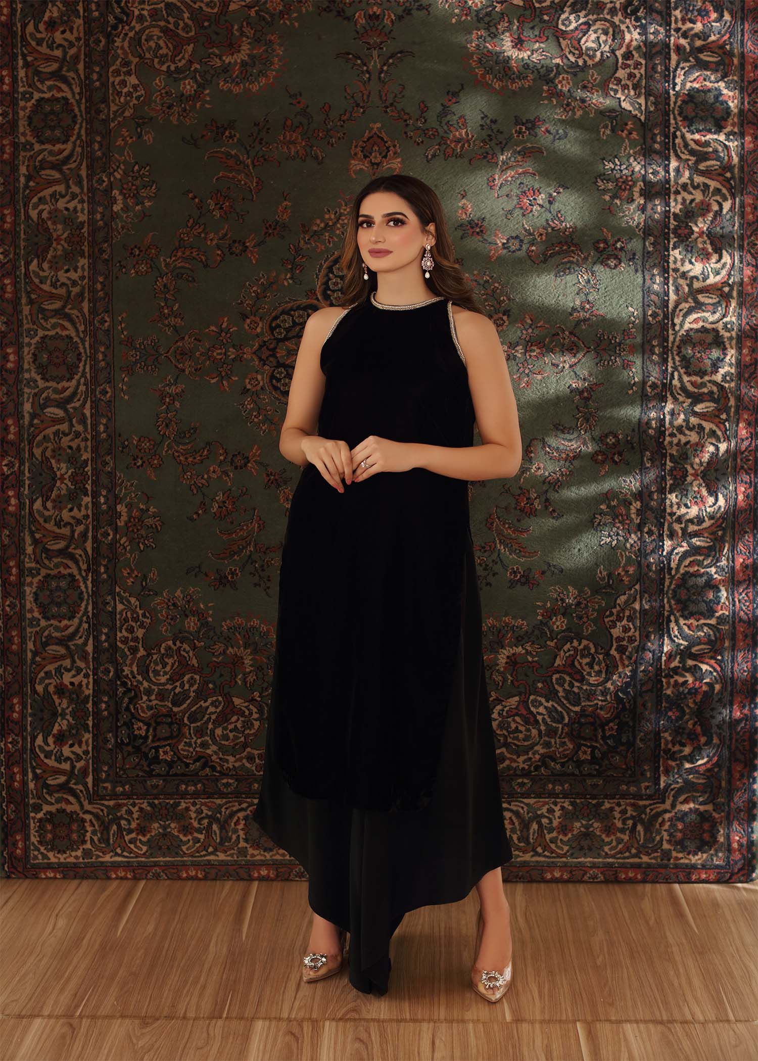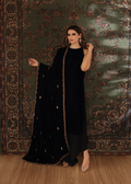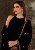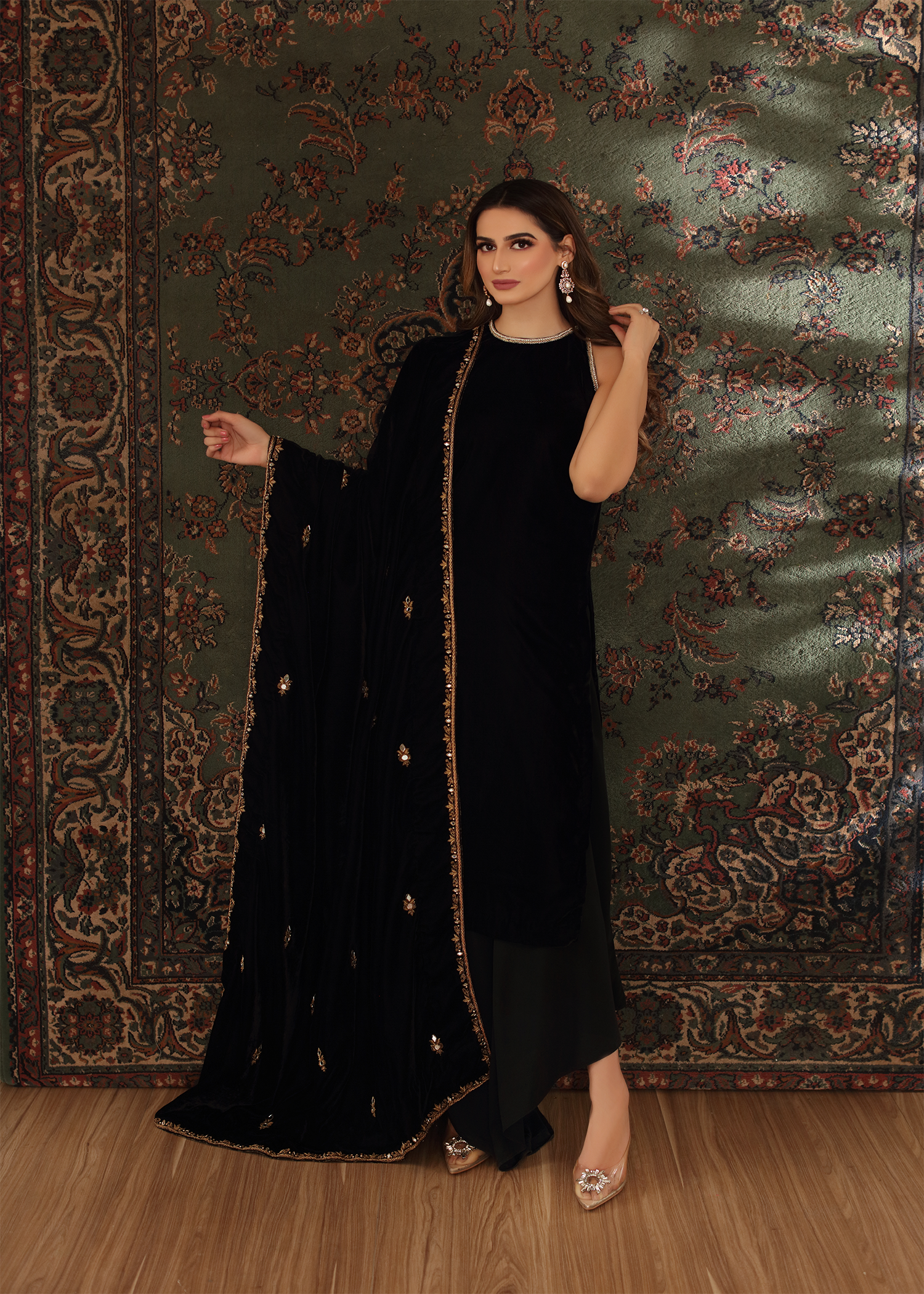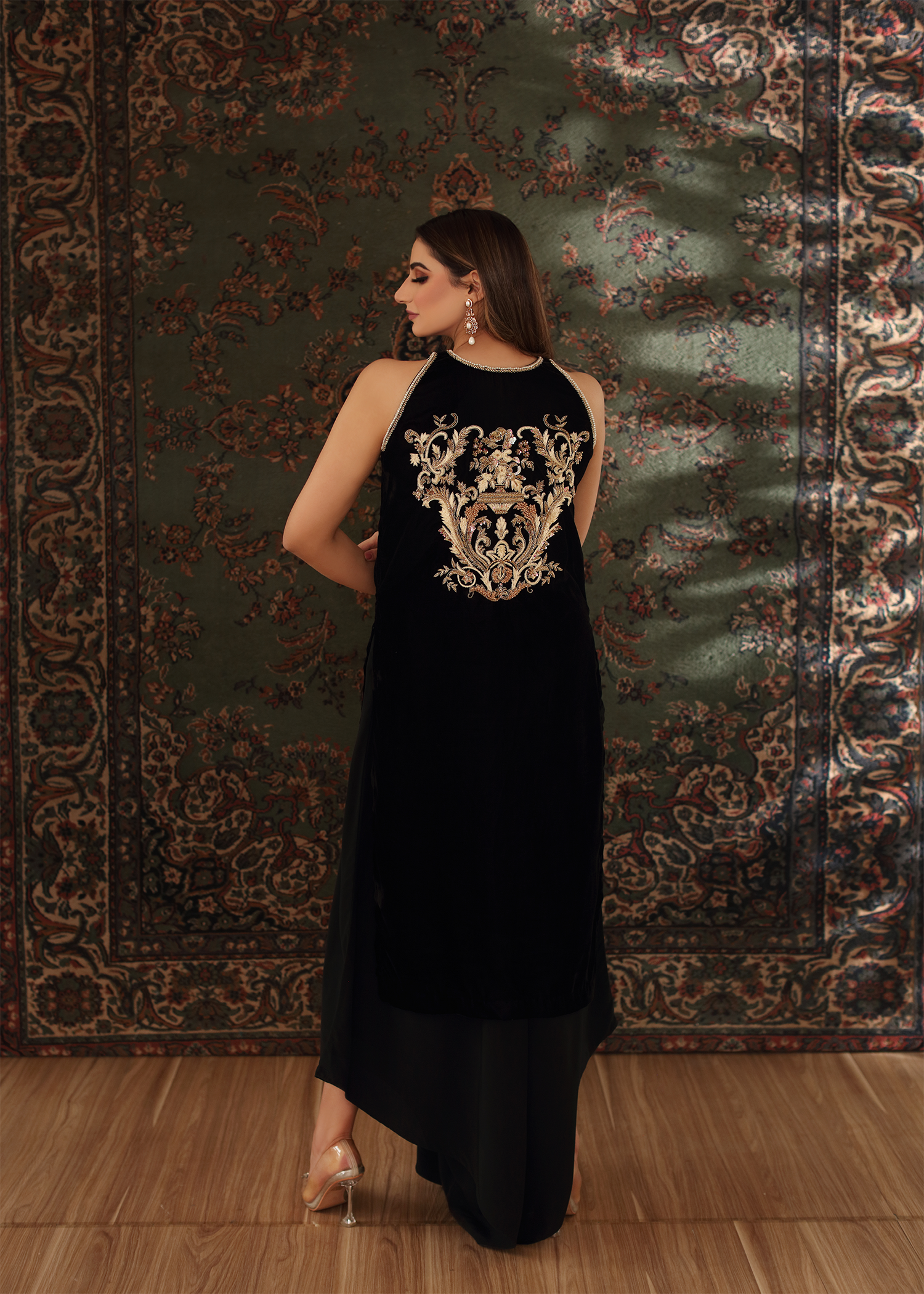 Black velvet halter neck shirt handworked with resham, dabka, tilla and zardozi on the neckline, sleeves and at the back. Paired with black flared pants. Can be paired with black velvet Shawl all handworked with resham, dabka, zardozi and mirrorwork details
