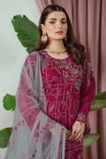 Embroidered Chiffon front with sequins Embroidered Chiffon back Embroidered Chiffon sleeves Embroidered organza sleeves lace Embroidered organza ghera lace Embroidered net dupatta – 2.50 Meter Raw silk trouser – 2.5 Meter Embroidered organza trouser lace.