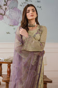 Embroidered Chiffon front with sequins Embroidered Chiffon back Embroidered Chiffon sleeves Embroidered organza sleeves lace Embroidered organza ghera lace Embroidered net dupatta – 2.50 Meter Raw silk trouser – 2.5 Meter Embroidered organza trouser lace.