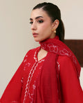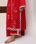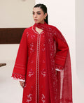 A captivating coral red ensemble that radiates timeless elegance and charm. The long-length front-open shirt is adorned with Parsigara embroidery in delicate hints of red and white, creating a harmonious play of tones. Intricate cutwork detailing on the side slits and hem adds refinement, while schiffli-embroidered sleeves finished with printed facings on both the sleeves and trouser elevate the look with thoughtful craftsmanship. Paired with a contrasted red slub monar dupatta featuring a 4-sided embroidered border, Capucine beautifully blends classic artistry with modern sophistication.