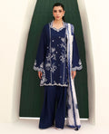 Dahlia features a timeless navy blue hue that embodies both elegance and sophistication. The short-length shirt is beautifully adorned with white-on-blue embroidery and detailed with scalloped sleeves, creating a refined yet modern look. It is paired with a white silk printed dupatta finished with 4-sided tassels and complemented by a classic farshi shalwar. Crafted from premium cambric and silk fabrics, this ensemble perfectly blends traditional charm with contemporary finesse.