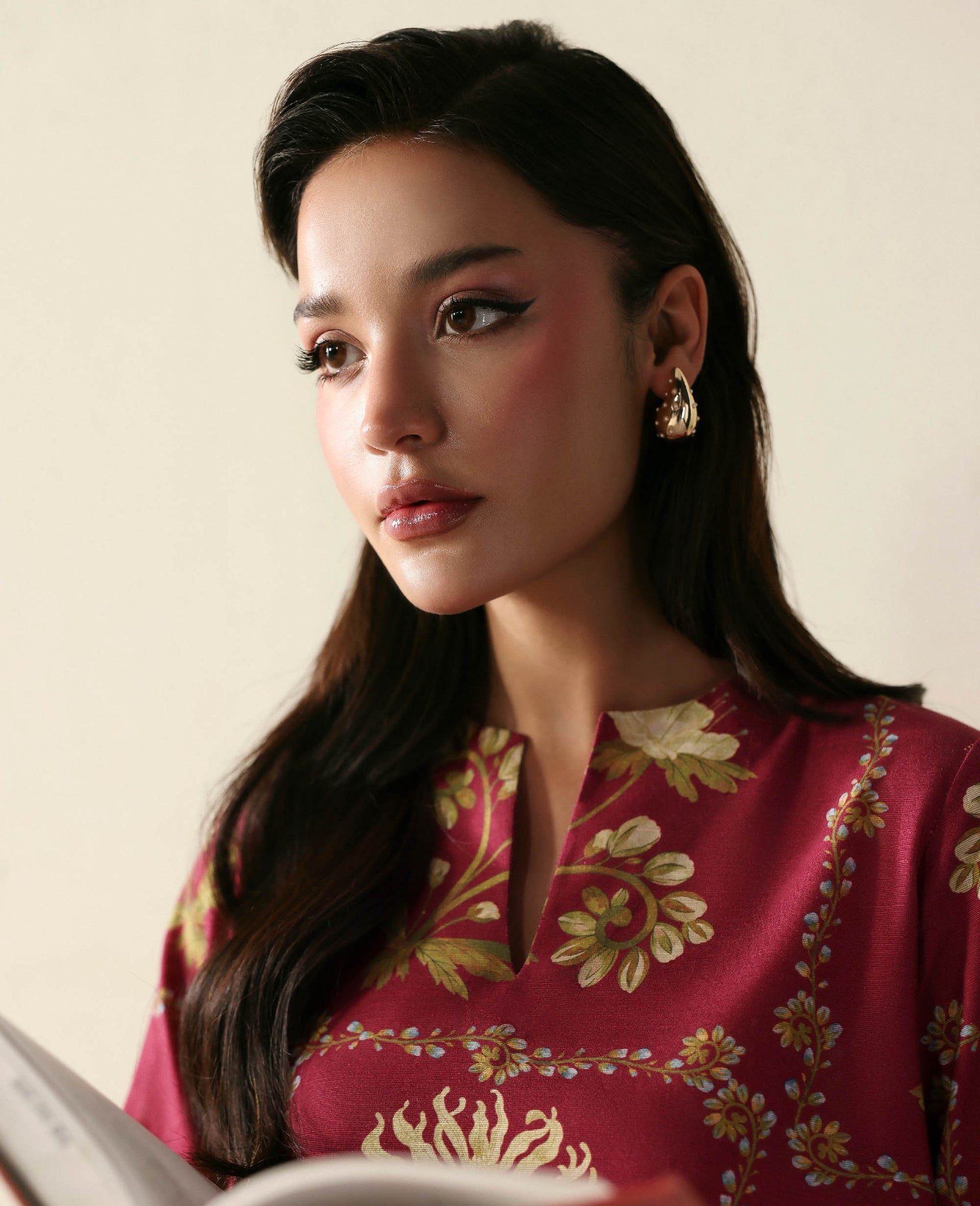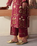 A maroon printed shirt with an all-over floral design, paired with matching maroon trousers featuring subtle beige and green floral prints. The harmonious blend of bold florals and minimalist accents creates a sophisticated, yet vibrant look.