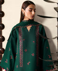 A vibrant emerald green short-length shirt adorned with multicolor embroidery, featuring a delicate front spray and beautifully crafted sectional borders. Paired with a twill marina shawl detailed with a four-sided embroidered border and soft tassels, this look comes together with wide-leg khaddar trousers for an effortlessly elegant and modern finish.