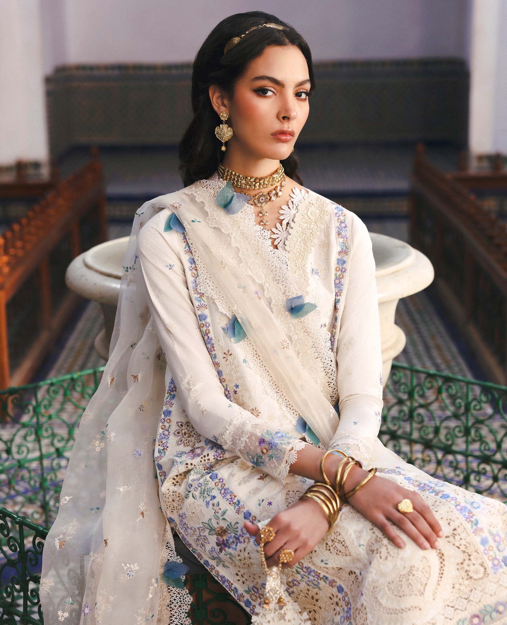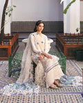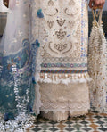 This three-panel cream shirt features tonal crochet-inspired embroidery, giving it a delicate handcrafted feel. The center panel is kept refined with modern elements, while the side panels bloom with botanical and floral motifs in soft hues of blue, lilac, coral, and green, subtly highlighted with white accents. Finished with a luxurious cream organza hem border, the silhouette feels complete and elegant. The sleeves are detailed with delicate floral sprays and organza edging, while the cream organza dupatta with contrast-composed pallus adds the perfect finishing touch.
