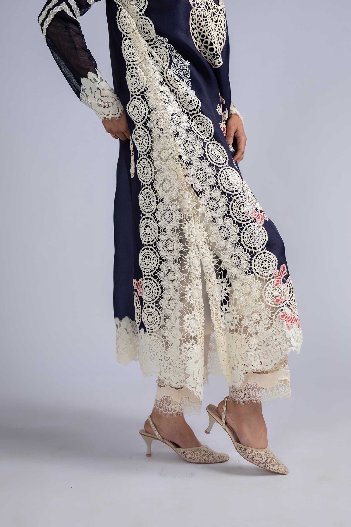 Given our Pakistani cultural background, we understand the significance of modesty. Therefore, we may make adjustments to certain design elements for modesty reasons. Examples of modifications include transforming low backs into traditionally styled regular backs, replacing drop shoulders with normal shoulders, concealing exposed stomachs, and attaching sleeves to sleeveless dresses.