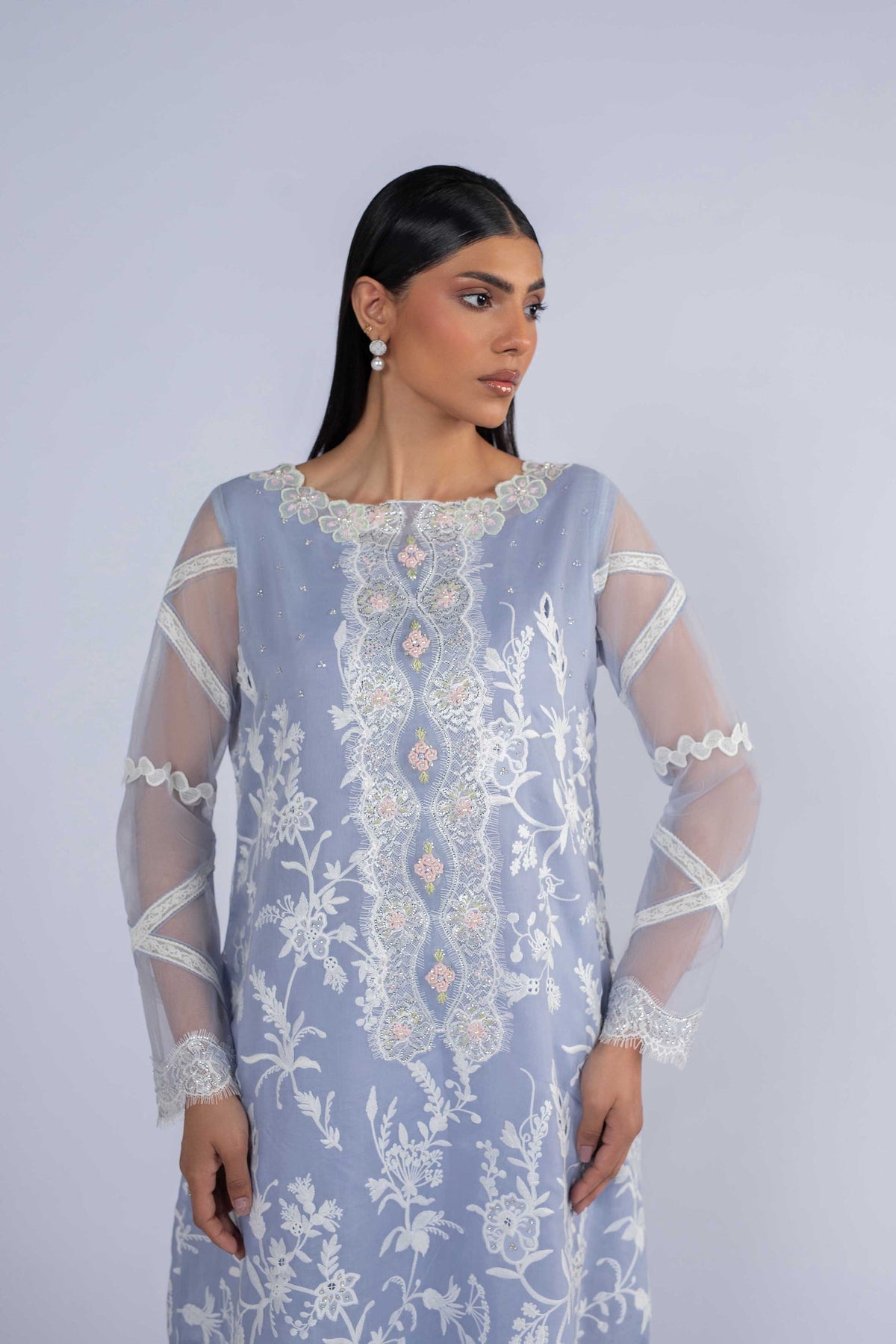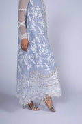 Elegant lavender cotton-organza with off-white embroidery and laser cut borders. Daman features handcrafted pink bullion roses, nakshi, dabka and bedki. Neckline adorned with delicate chantilly lace, enhanced with intricate handwork for a refined finished.